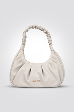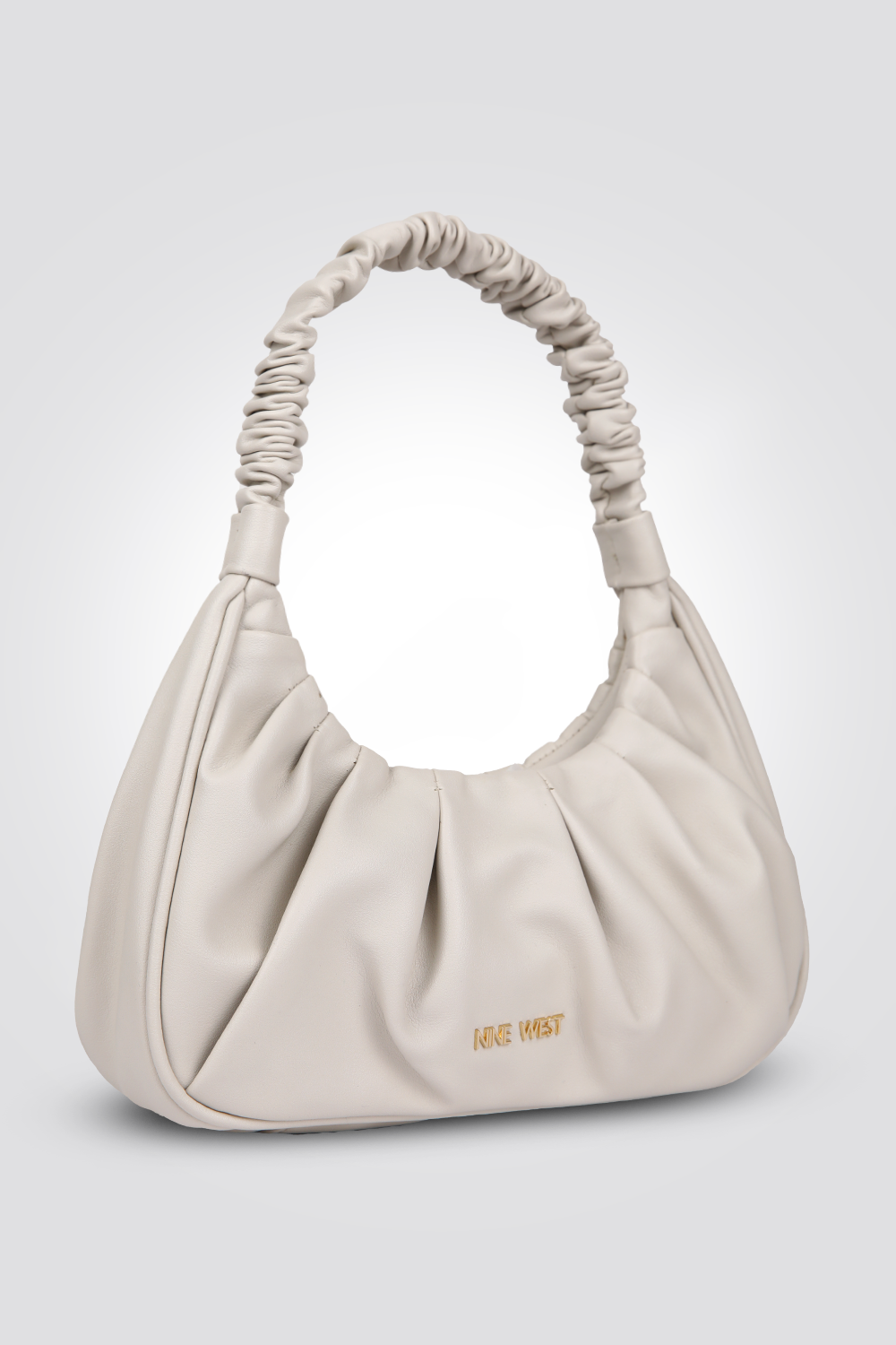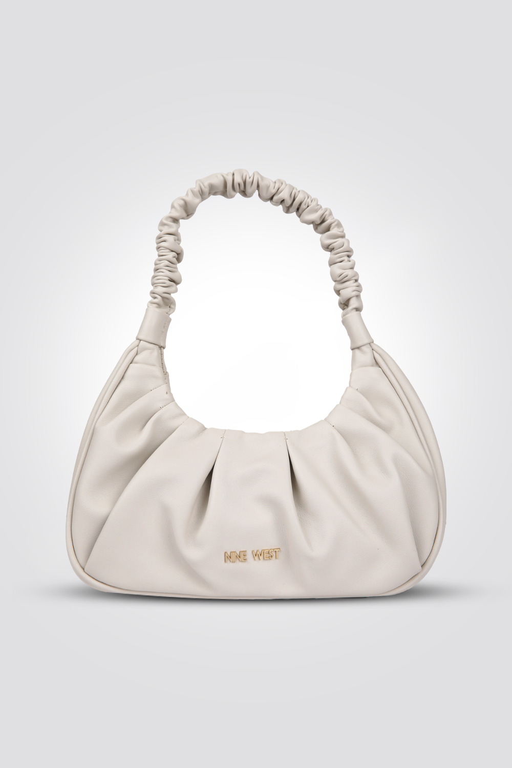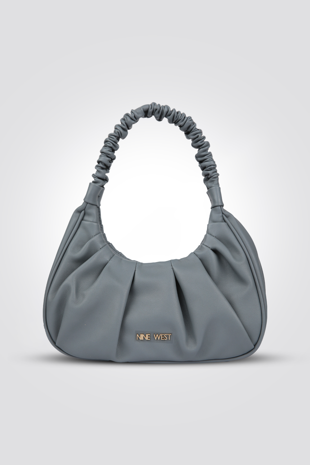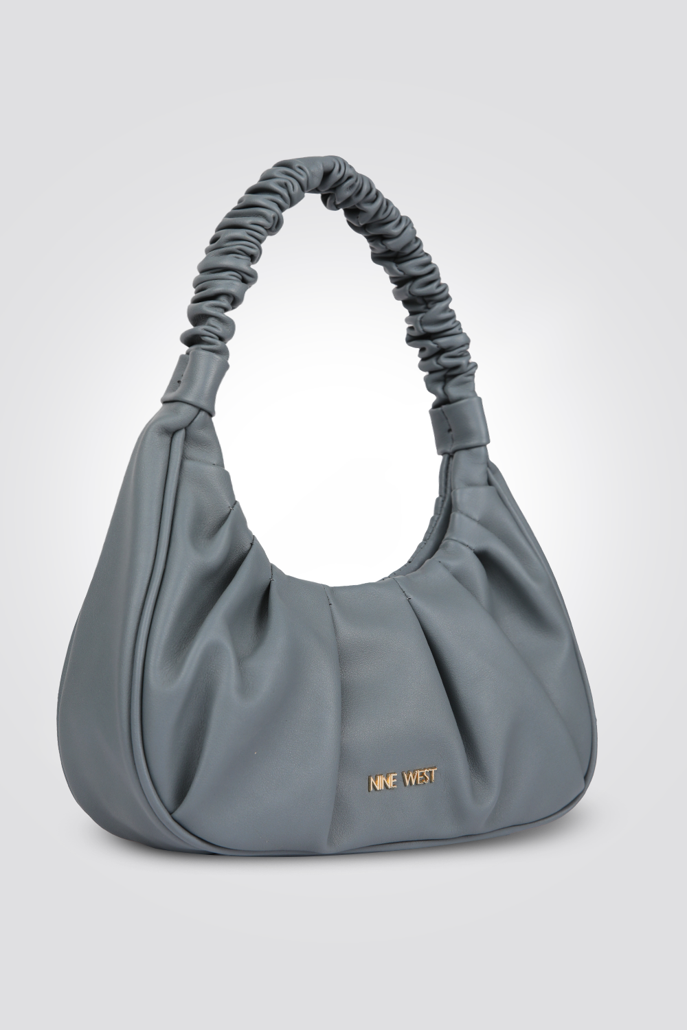 תיק צד קטן נפוח מבית המותג NINE WEST מגיע עם תא אחסון אחד, רצועה עם כיווצים ולוגו קטן בצבע זהוב.