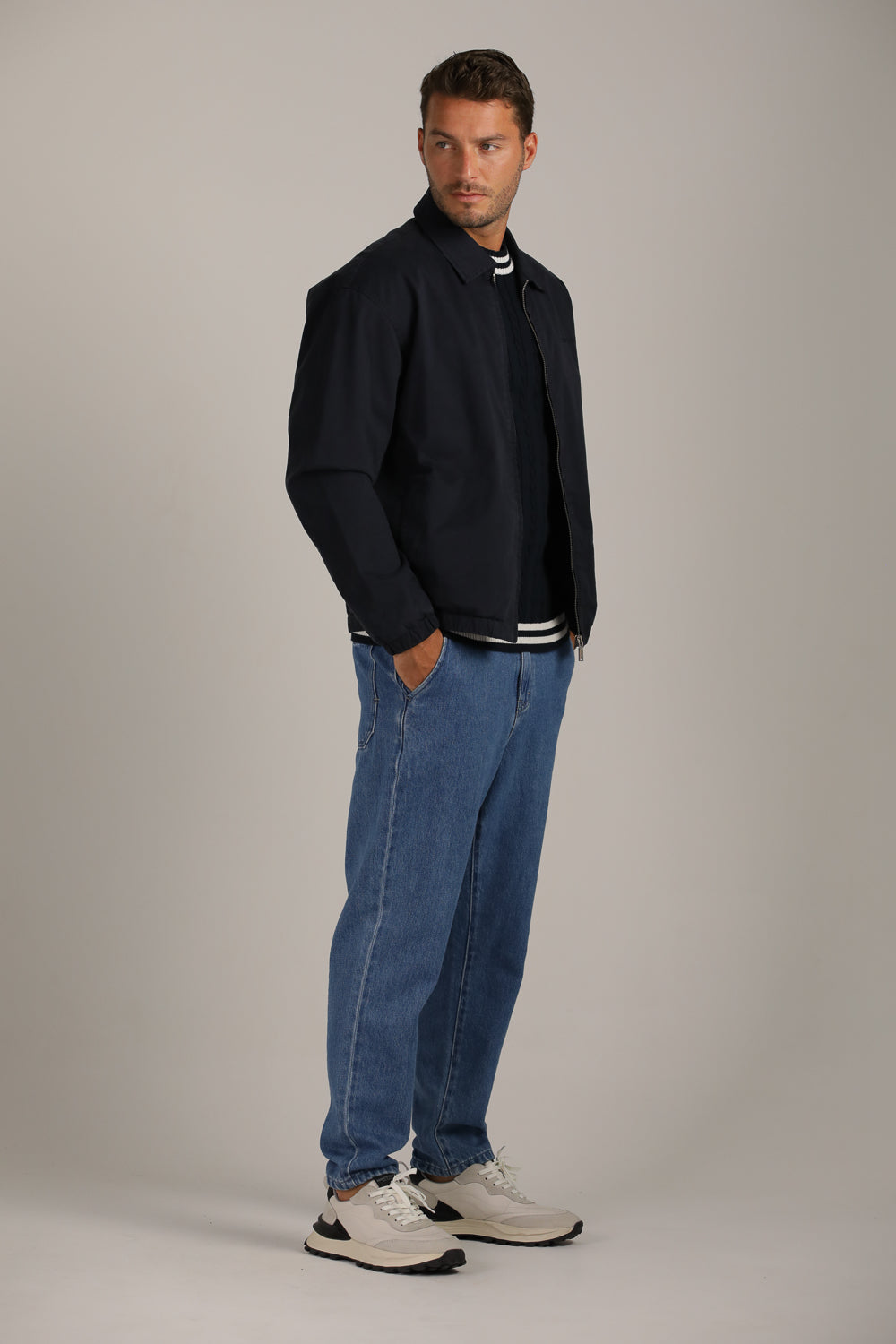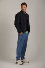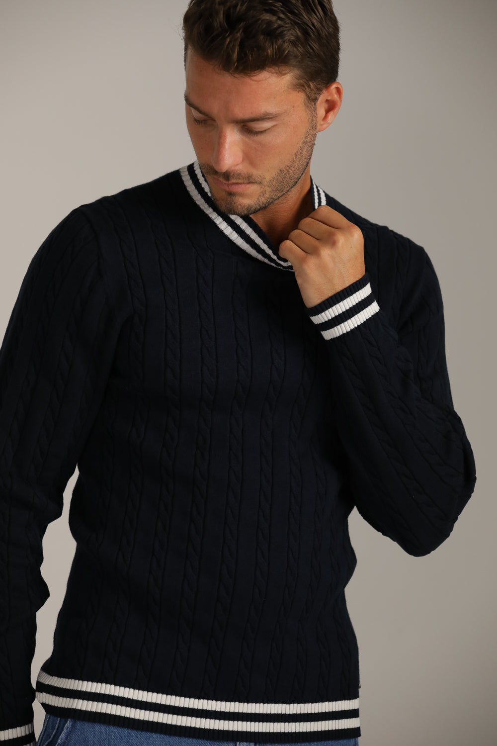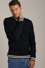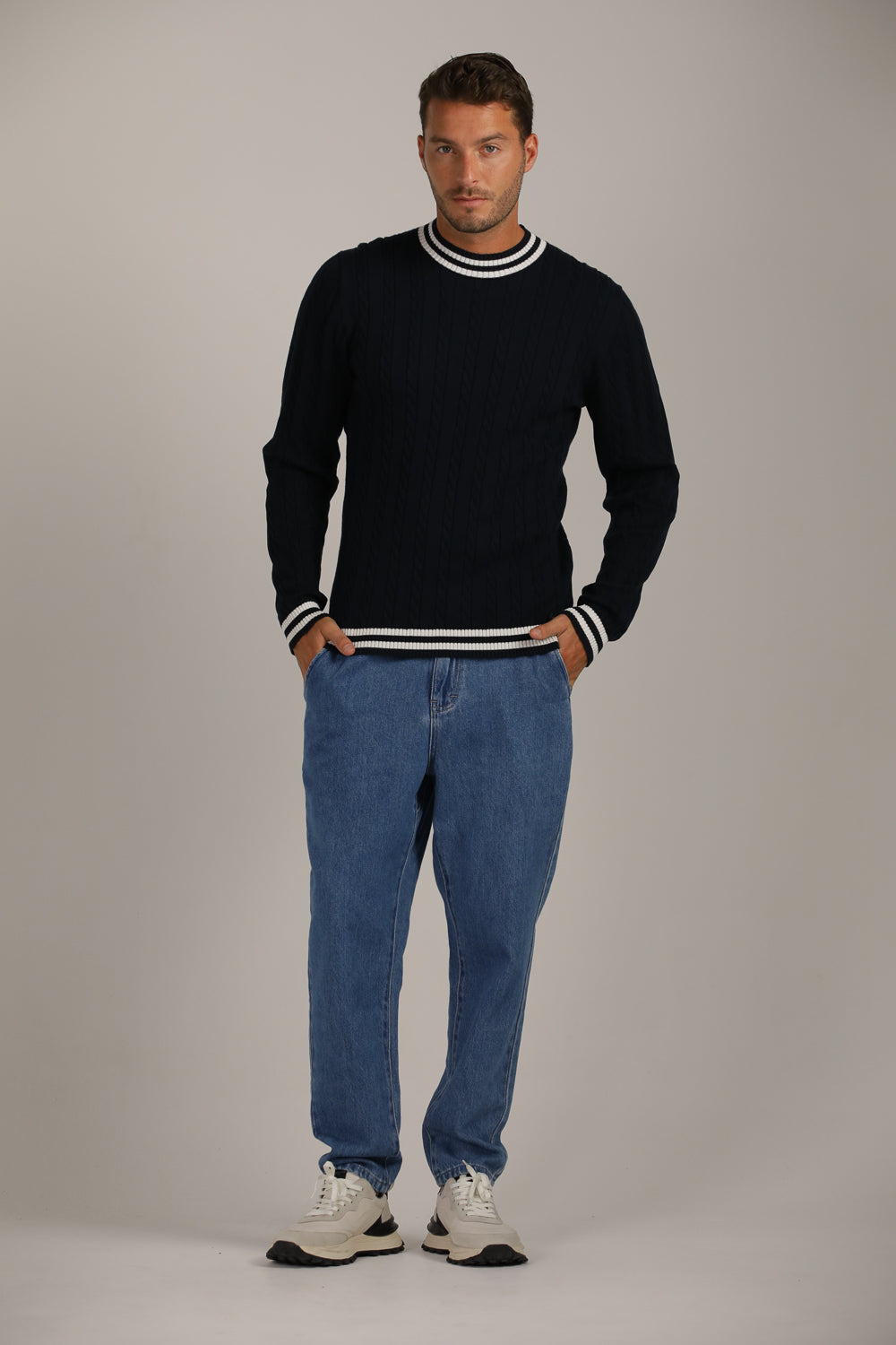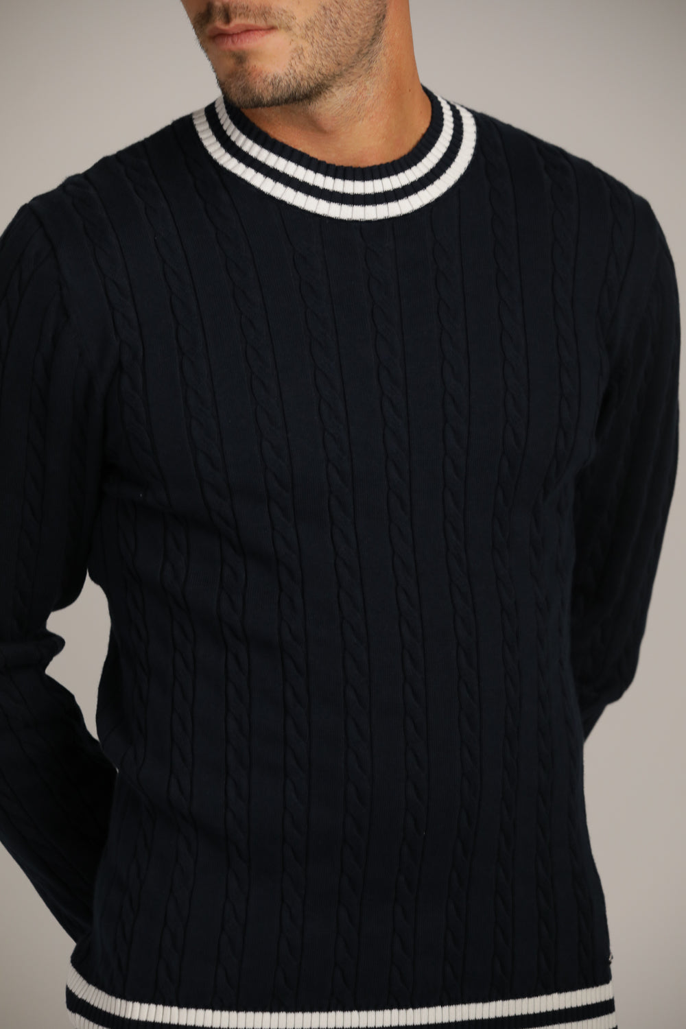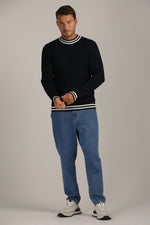 סריג מבית המותג KENNETH COLE לגברים בצבע נייבי, עשוי מבד סרוג במרקם צמרי רך ונעים למגע, בגזרה צמודה קלה ונוחה, בעצוב טקסטורת צמות, בעל צווארון עגול, שרוולים ארוכים ופסי ריב קונטרסטיים נייבי ולבן בקצה קו הסריג, הצווארון והשרוולים.