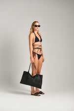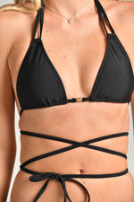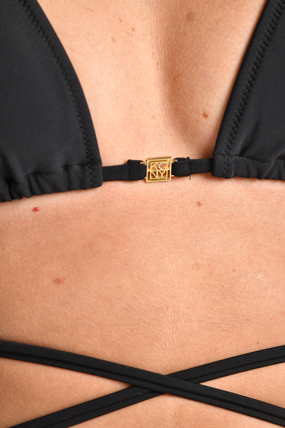 טופ ביקיני מבית המותג KENNETH COLE לנשים, בגזרה משולשים, בגימור מאט, בעל אבזם קטן מוזהב עם הטבעת לוגו המותג ומכיל רצועות קשירה בחלק העליון ובחלק התחתון רצועות ארוכות הניתנות לליפוף.