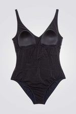 בגד ים שלם מבית המותג GOTTEX בצבע שחור עם מחשוף וי וגב נמוך, כתפיות מתכווננות וקאפים מובנים.