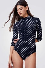 בגד ים שלם מבית המותג GOTTEX, בגד ים שלם עם שרוולים באורך 3/4 בהדפס נקודות שחור לבן, מפתח צוואר סגור עם רוכסן נסתר קדמי, בטנה באזור החזה וקאפים רכים מובנים. מתאים גם לנשים מניקות, מומלץ לשלב עם חצאית הנמכרת בנפרד מקולקצית בגדי הים הצנועים