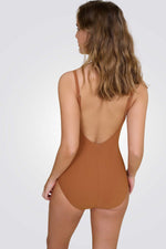 בגד ים שלם מבית המותג TURKIZ בגזרה מחטבת, עם קאפים מובנים, גב פתוח, מחשוף מרובע וכיווצים באיזור המותניים.