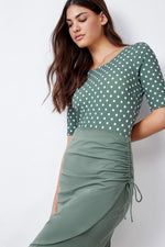 חצאית מבית המותג GOTTEX, חצאית מעטפת קצרה מבד לייקרה חאקי עם כיווצים בצד וקשירה בסיומת, חלק עליון נמכר בנפרד בד: 77% פוליאמיד 20% אלסטן