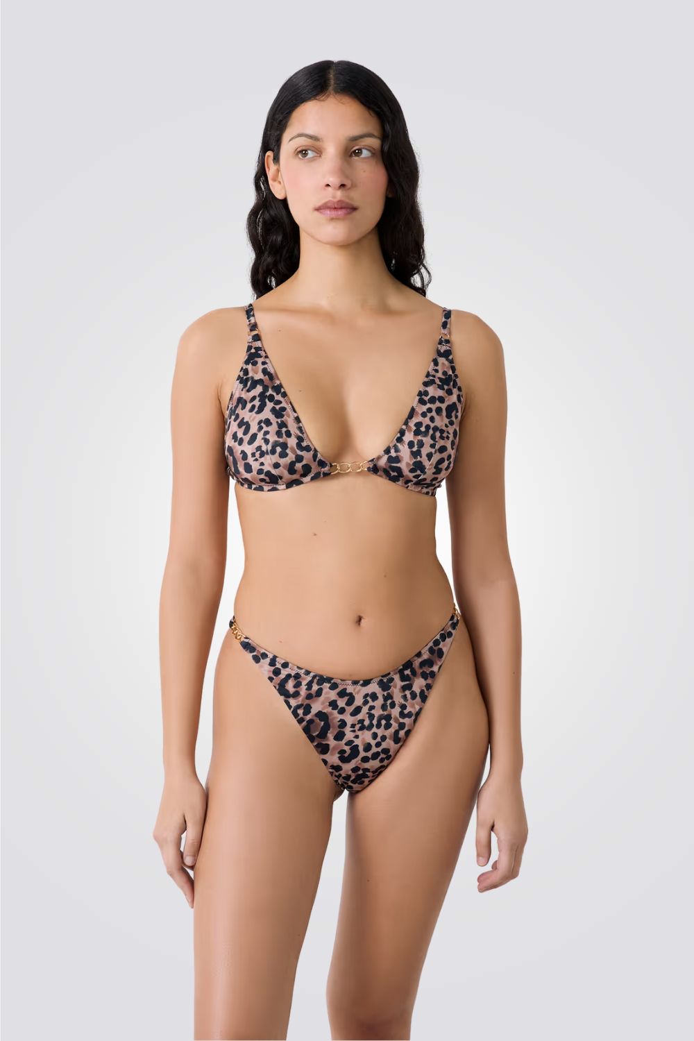 חזיית בקיני משולשים מבית המותג ETAM בעלת פרינט מנומר, ריפוד עדין רצועות מתכווננות, סגירת קרסים ושרשרת זהובה בחלקה הקידמי של החזייה.