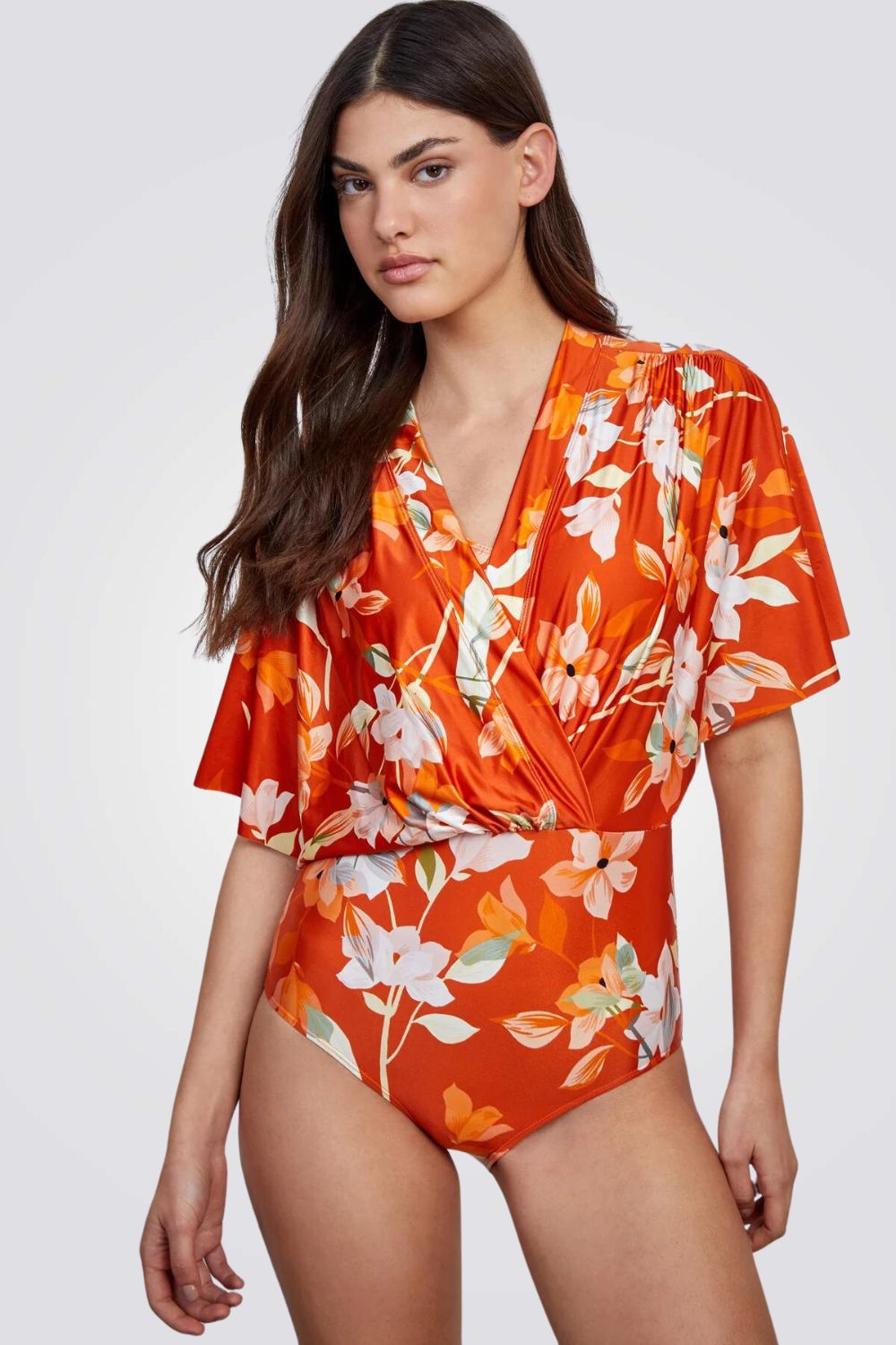 בגד ים שלם מעטפת פרחונית לנשים בצבע כתום