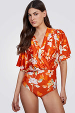 בגד ים שלם מבית המותג GOTTEX , בפרינט פרחוני בגווני כתום בגזרת מעטפת עם שרוול קצר בנופל. חלק תחתון נמכר בנפרד. הרכב בד:77% אלסטן 23% פוליאמיד