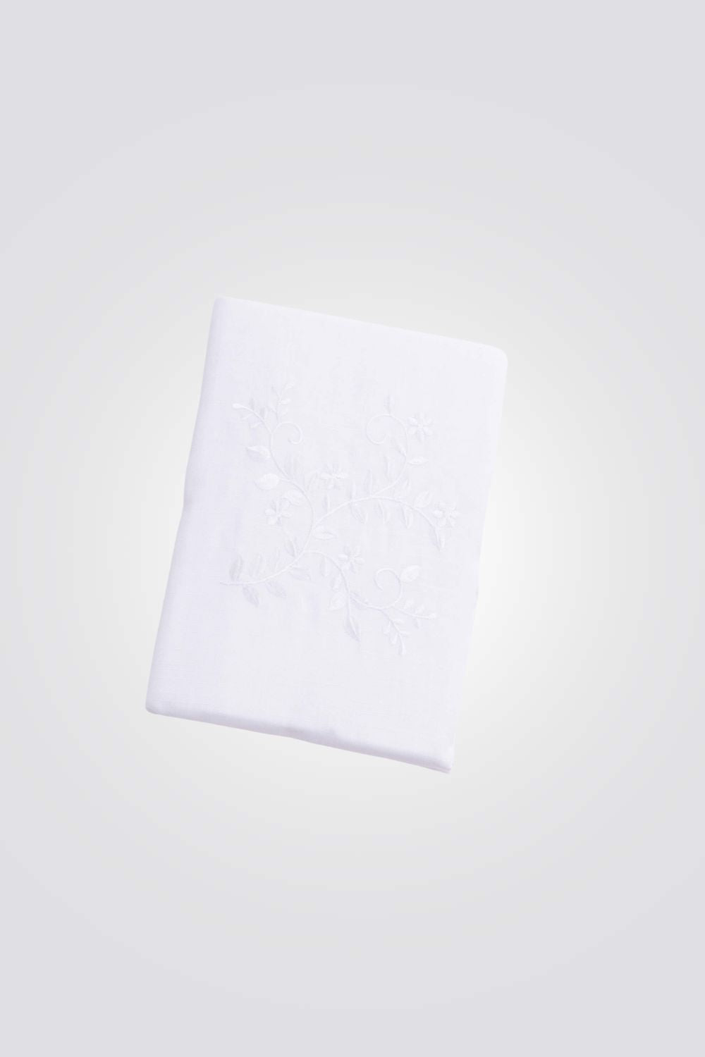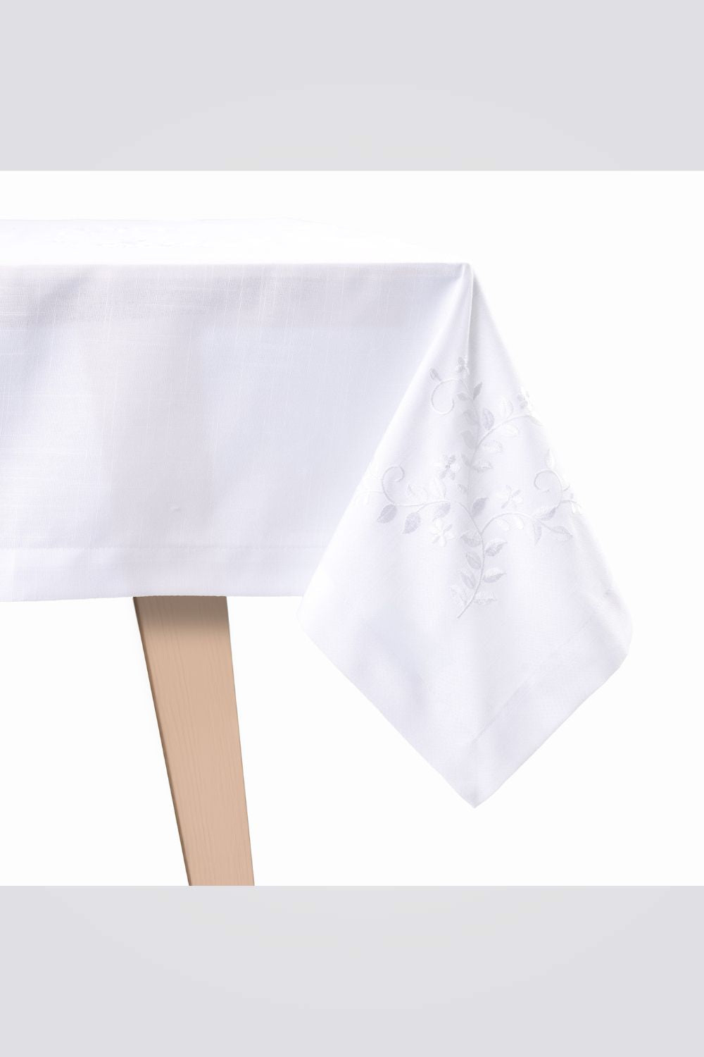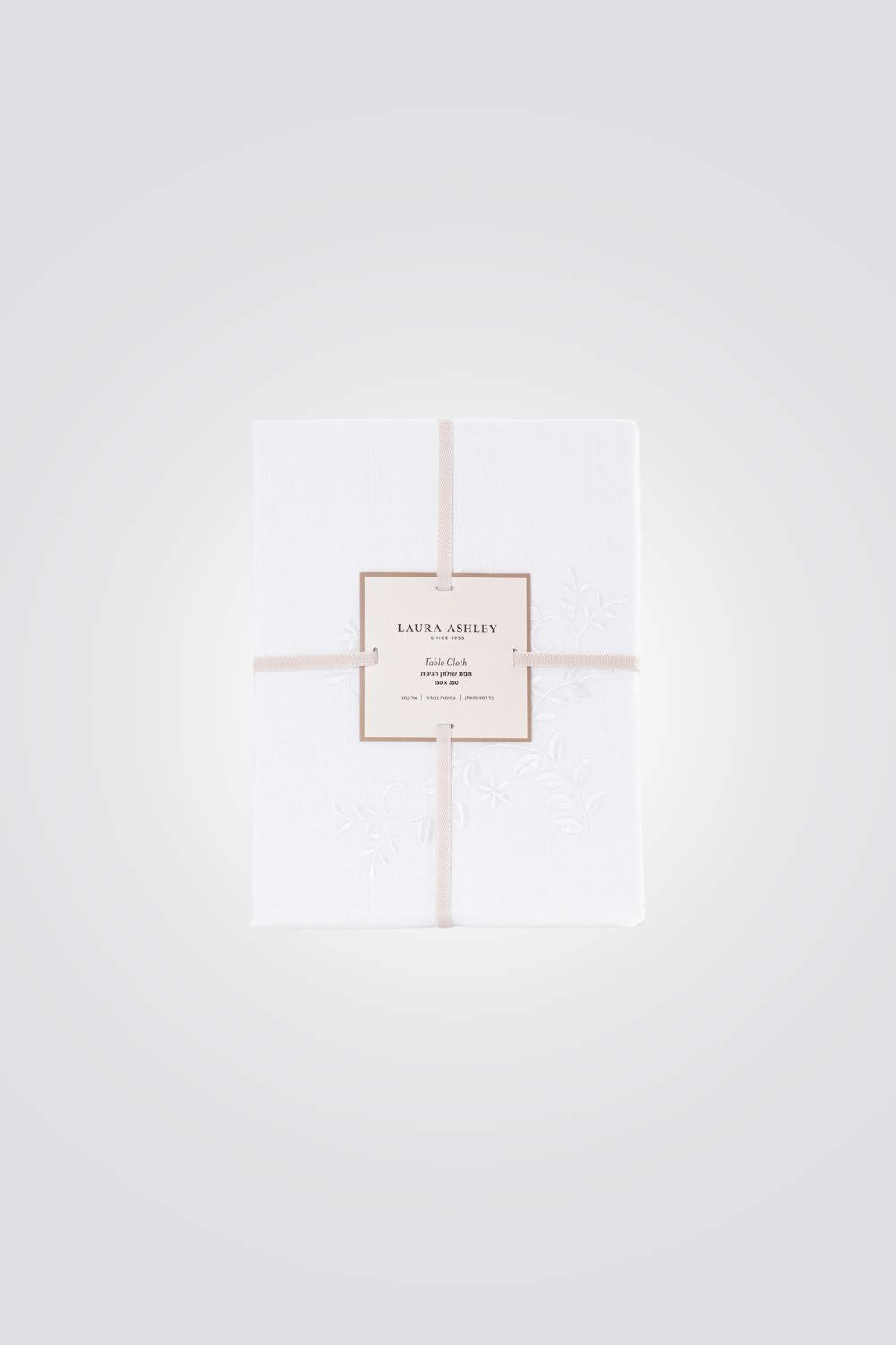 מפת שולחן מהודרת מבית המותג LAURA ASHLEY, בצבע לבן למראה שולחן יוקרתי וחגיגי, עם עיטורי רקמת פרחים .