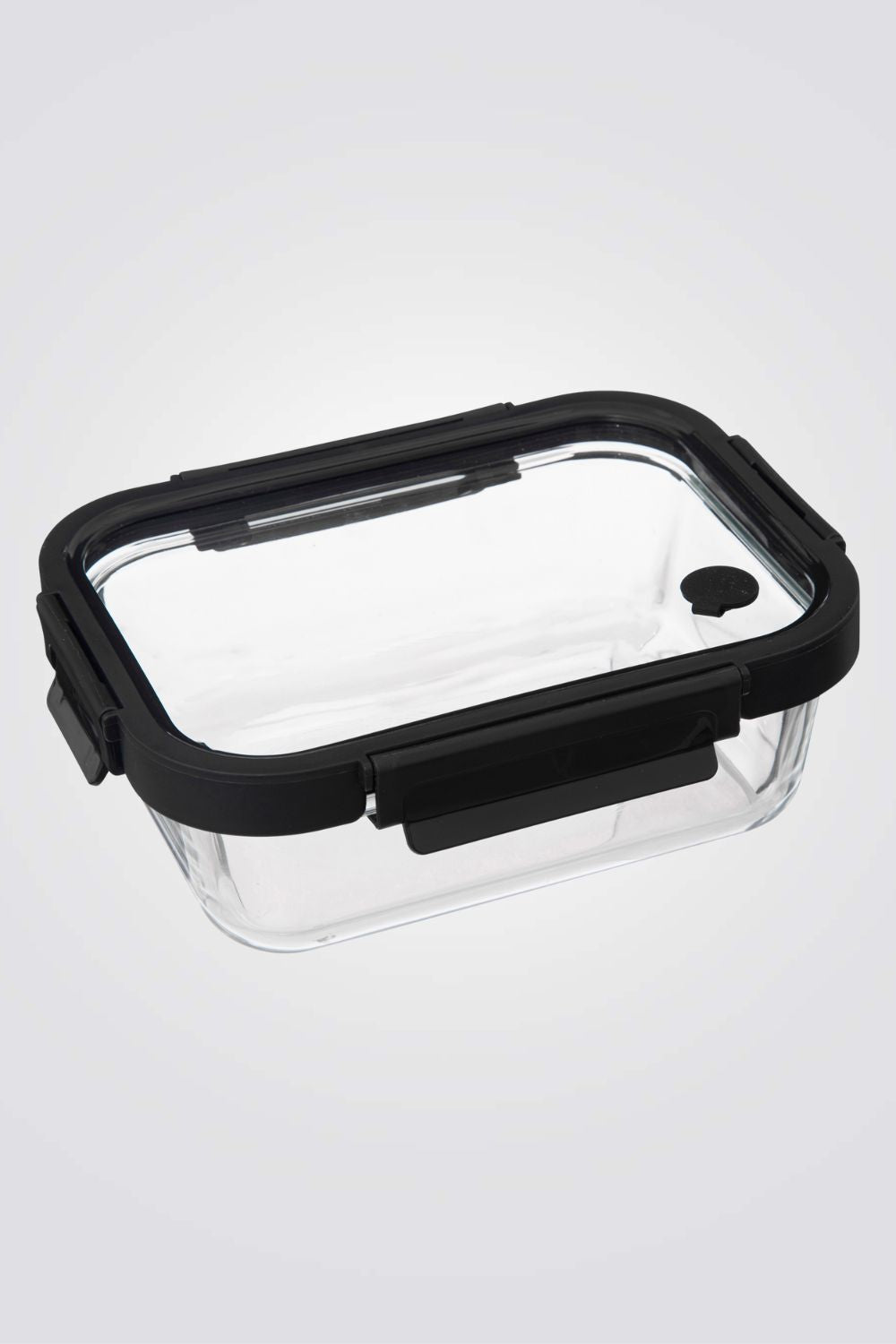 קופסת אחסון מלבנית מזכוכית, בעלת מכסה עם 4 קליפסים ומסגרת שחורה לאיטום מפני נוזלים.