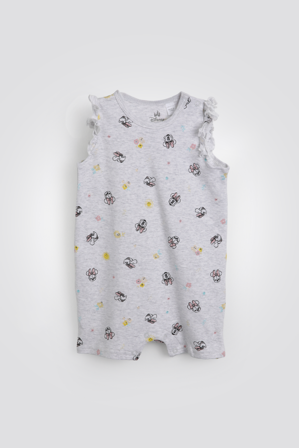 אוברול קצר לתינוקות מבית המותג DELTA העשוי מבד קליל ונעים עם הדפס מתוק של מיני מאוס, צווארון עגול, שרוולי מלמלה קטנים וסוגרי טיק-טק בכתף ובתחתית.