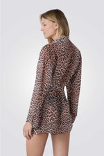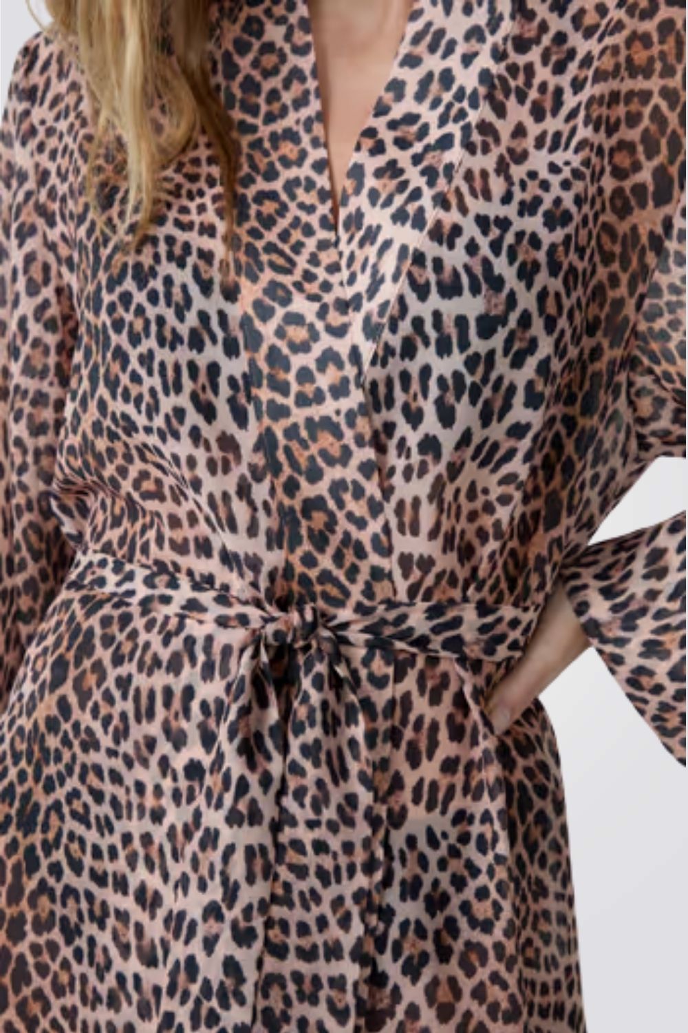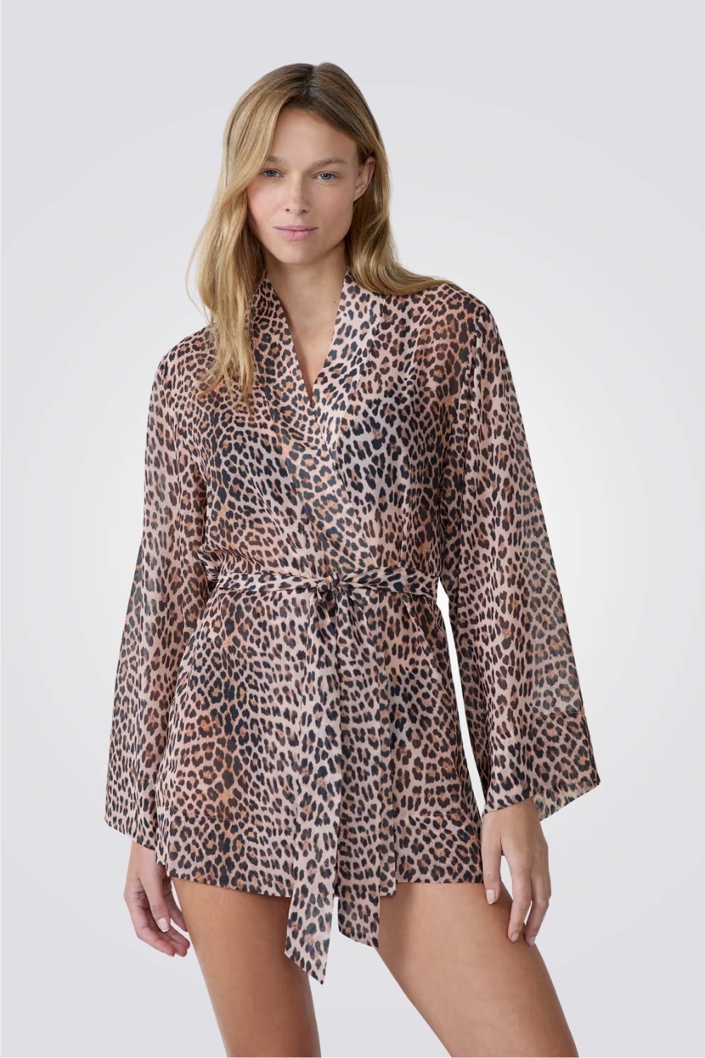 חלוק לילה מבית המותג ETAM, בעל גזרה קצרה ונשפכת, שרוולים ארוכים, שרוך קשירה בקו המותן ובהדפס מנומר מיוחד חצי שקוף.