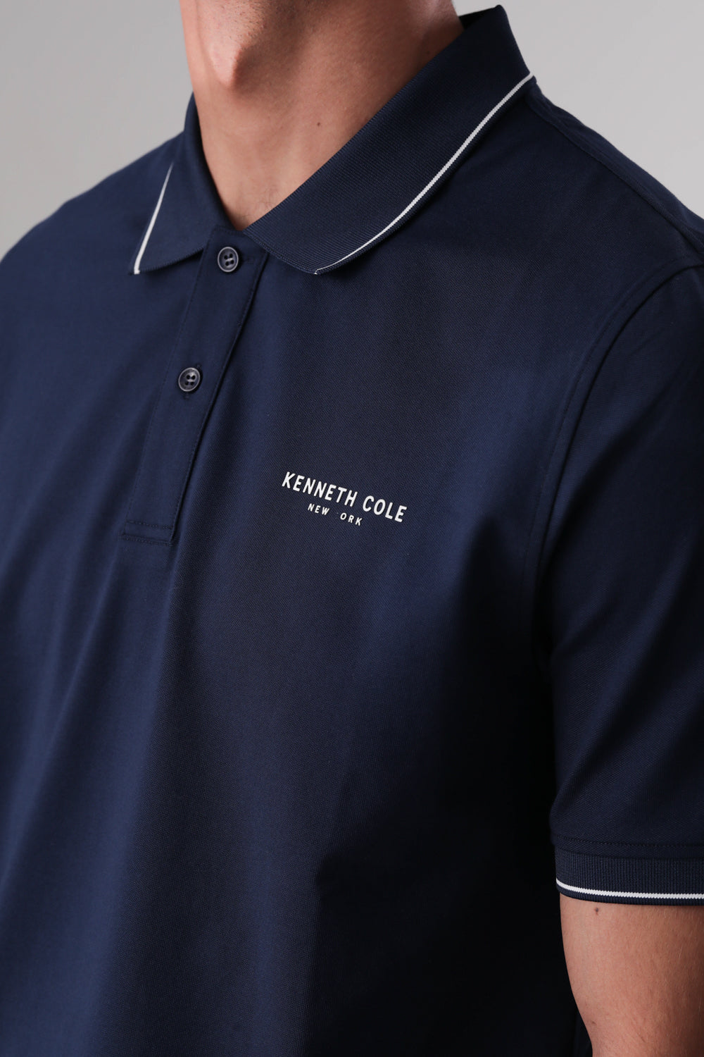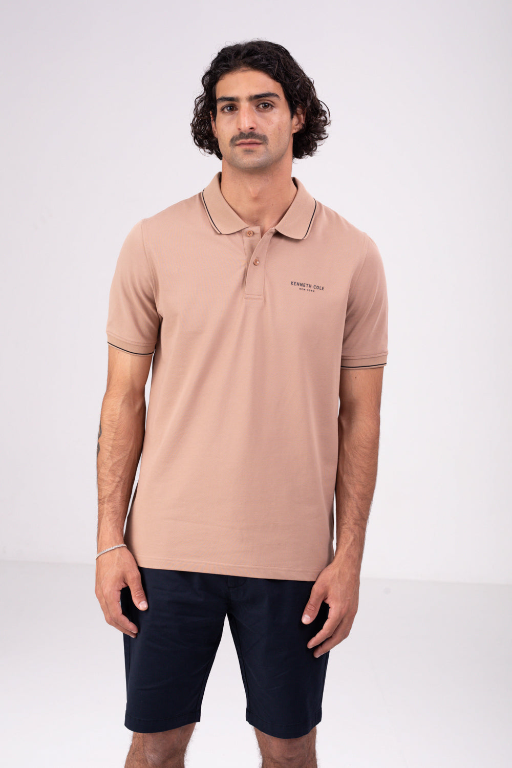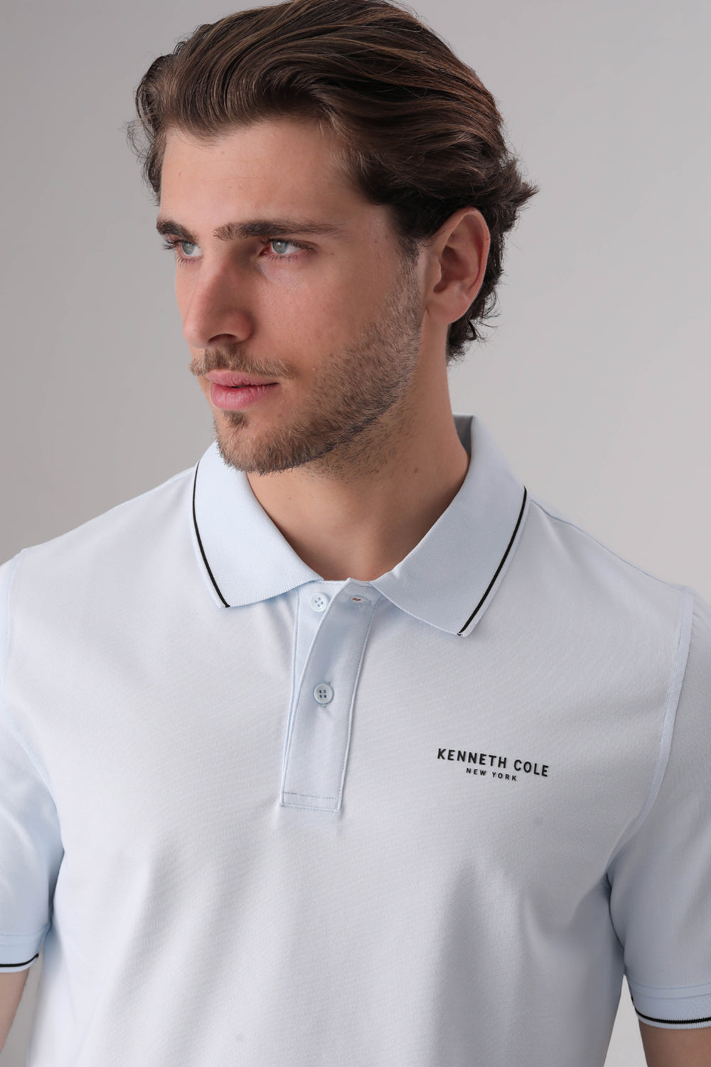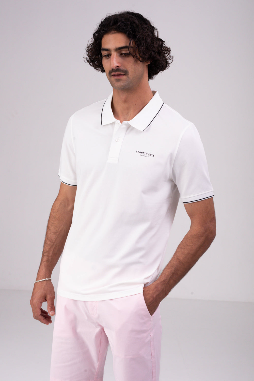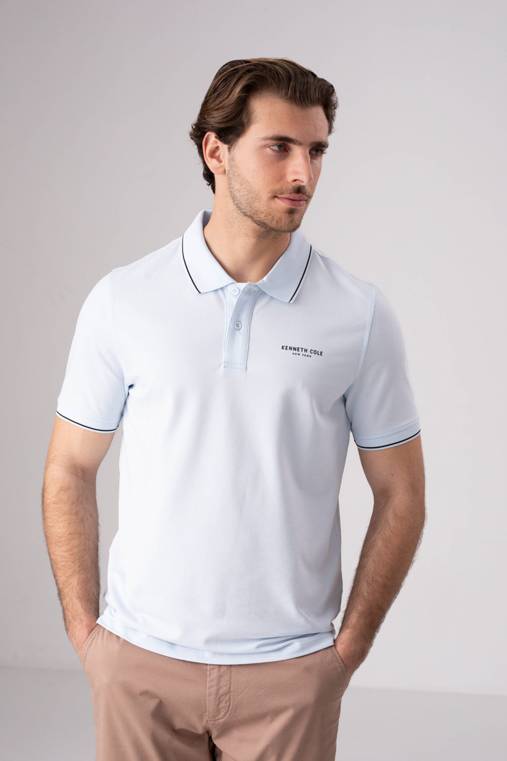 חולצת פולו מבית המותג KENNETH COLE לגברים, בעלת שרוולים קצרים, סמל המותג בקידמת החולצה, צווארון בעל כפתורים לפתיחה וסגירה ופס דק בסיומת השרוולים והצווארון.