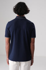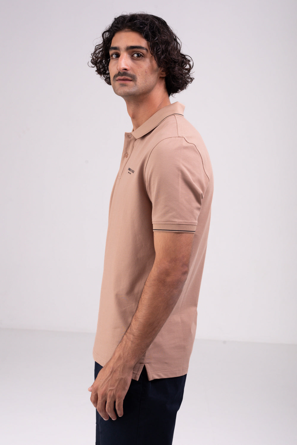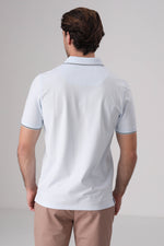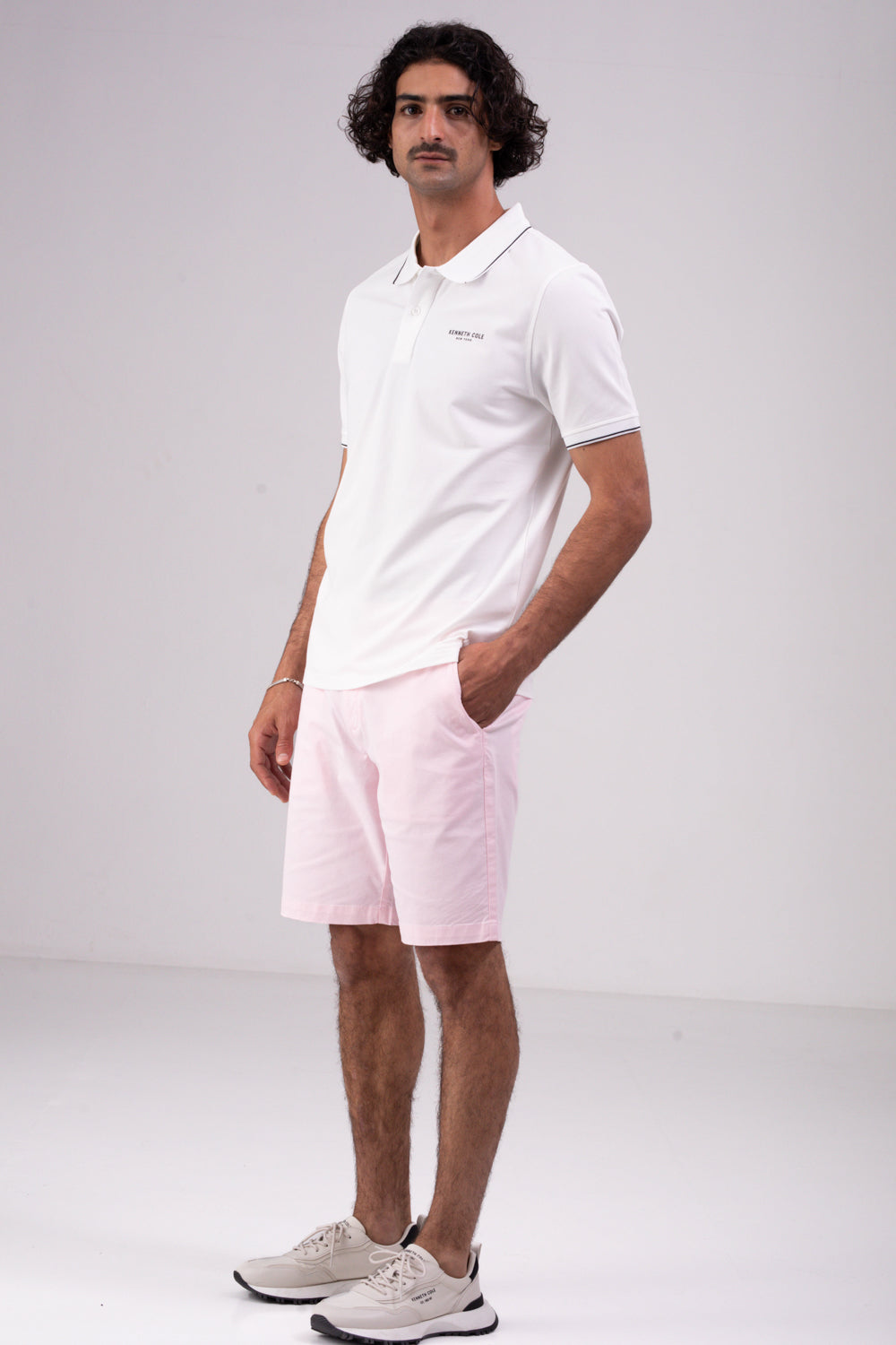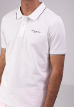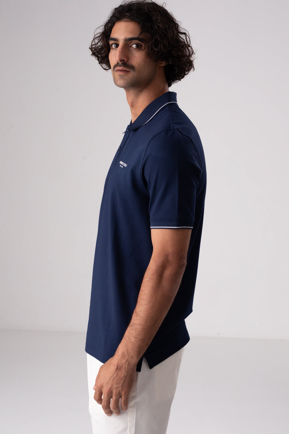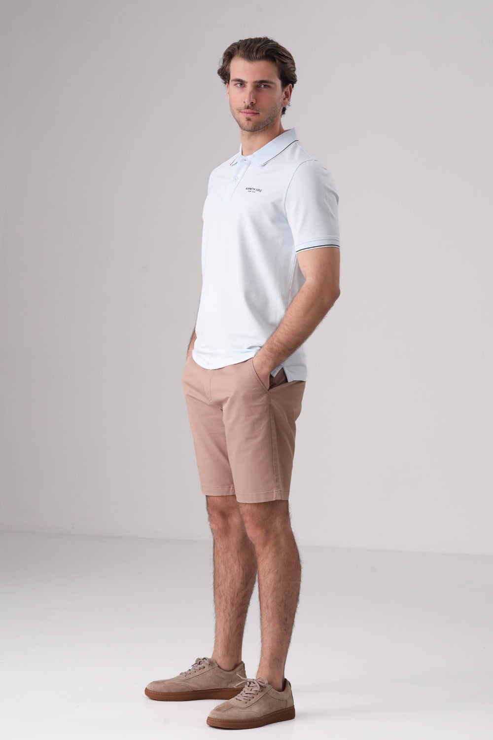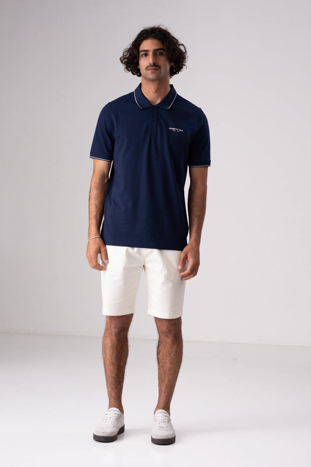 חולצת פולו מבית המותג KENNETH COLE לגברים, בעלת שרוולים קצרים, סמל המותג בקידמת החולצה, צווארון בעל כפתורים לפתיחה וסגירה ופס דק בסיומת השרוולים והצווארון.