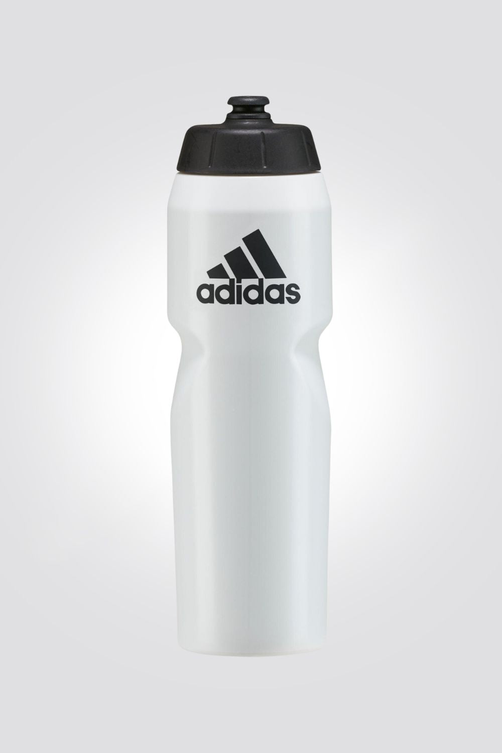 בקבוק שתיה בצבע לבן של המותג ADIDAS בעל קיבולת של 750 מ"ל. עם סימוני מדידה של כמות שתיית המים ושקעים לאחיזה נוחה.