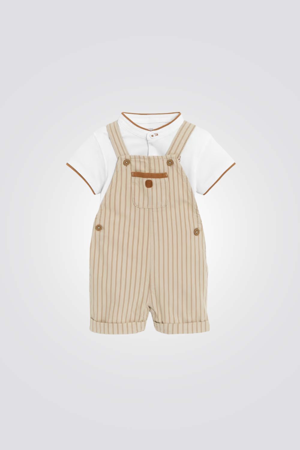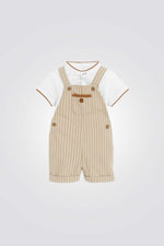 סט טישירט ואוברול מבית המותג OBAIBI, מכיל טישירט בצבע לבן עם פס חום בסיומת השרוולים והצווארון וסגירת כפתור בחזית, ואוברול בצבע חום עם פסים וסגירת כפתורים.
