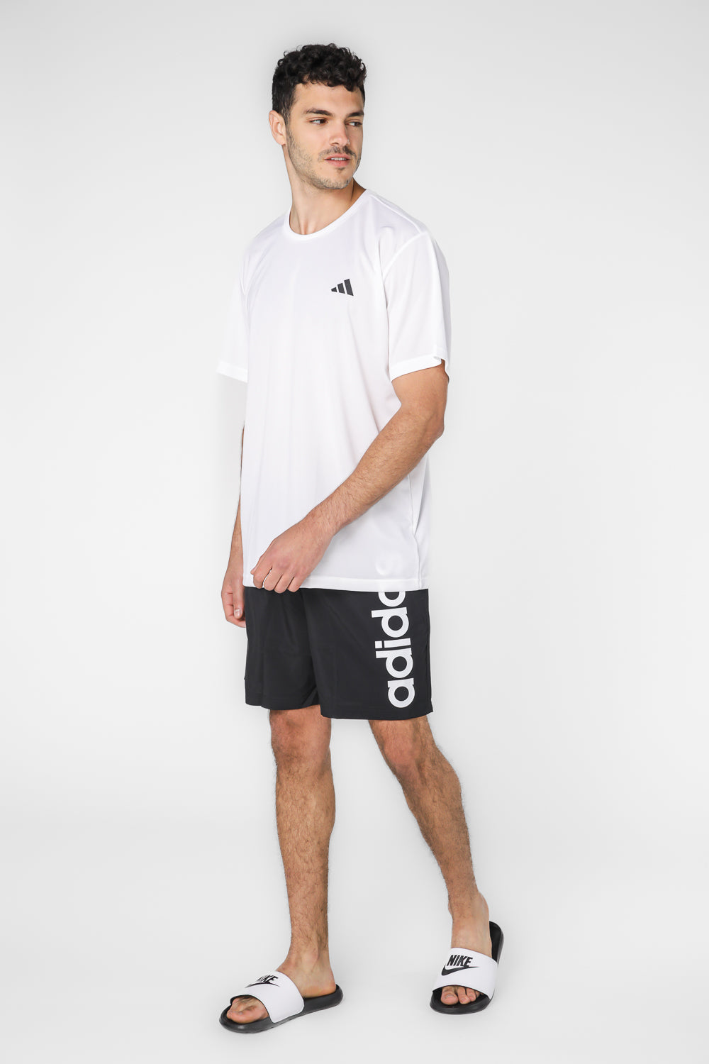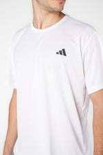 טישירט מבית המותג ADIDAS לגברים בצבע לבן, עשויה בטכנולוגיית AEROREADY מנדפת זיעה, קלילה ונוחה, צווארון עגול, שרוולים קצרים וסמל המותג בשחור מקדימה.