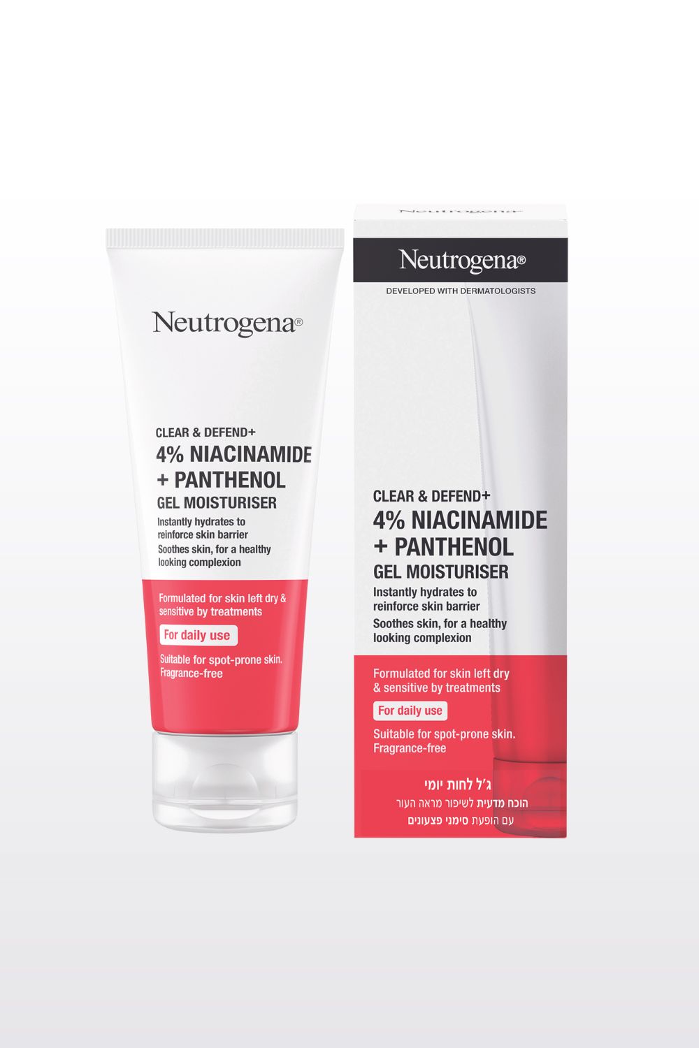 ניוטרוג'ינה קליר אנד דפנד + ג'ל לחות יומי המכיל 4% ניאצינמיד הידוע כמחליק ומשפר את המרקם והזוהר של העור, למראה עור אחיד בוריא יותר, ו-1% פנטנול המסייע להרגיע את העור ולשמור על מחסום הלחות של העור. ג'ל לחות במרקם קליל מחליק את העור ומשפר את הזוהר שלו, מעניק לחות מיידית. לשימוש יומי. פותח במיוחד לעור יבש ועדין לאחר טיפולים נגד פצעונים. פותח עם PH אופטימלי כדי למקסם את היעילות, תוך שמירה על העור וחיזוק מחסום הלחות שלו. נטול בישום, מתאים לעור מעורב, שומני ונוטה לפצעונים. פותח בשיתוף עם דרמטולוגים