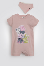 אוברול קצר לתינוקות מבית המותג DELTA העשוי מבד בטקסטורת ריב נעימה עם הדפס של מיני מאוס, צווארון עגול, שרוולים קצרים וסוגרי טיק טק בכתף ובתחתית. מגיע עם סינר.