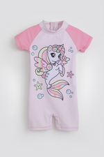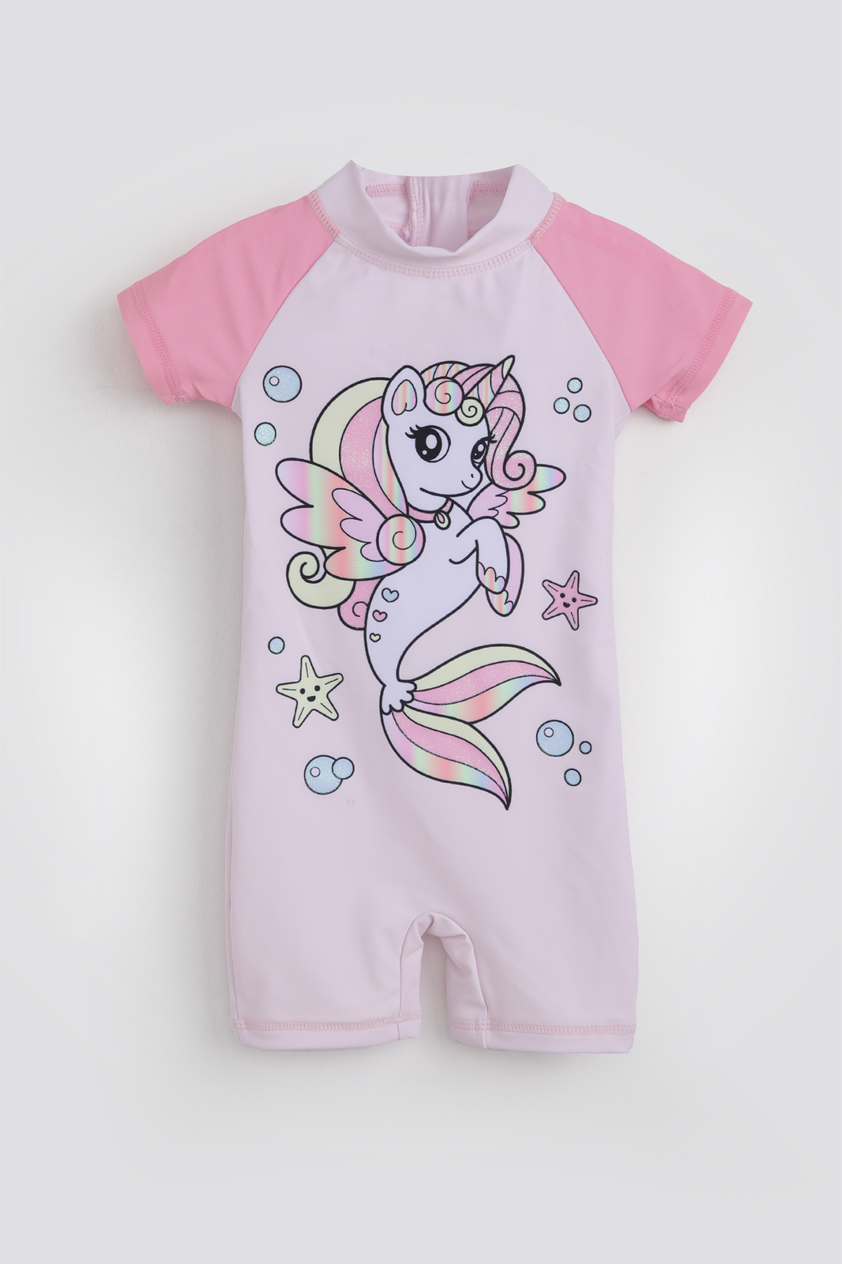בגד ים לתינוקות מבית המותג DELTA בגזרת אוברול קצר במוטיב מתוק של חד קרן עם צווארון עגול, שרוולים קצרים וסוגר אחורי.