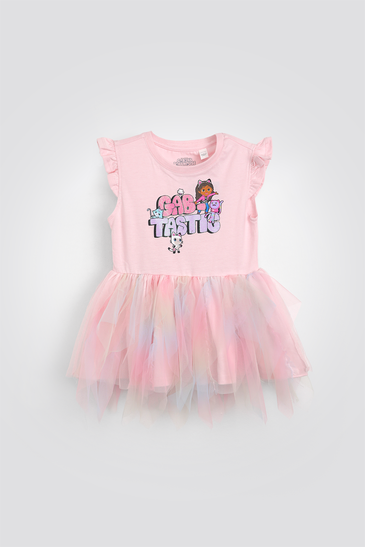 שמלה מסתובבת לילדות מבית המותג DELTA בעלת הדפס של בית הבובות של גבי, מפתח צוואר עגול, שרוולי מלמלה קצרים וחצאית טול.