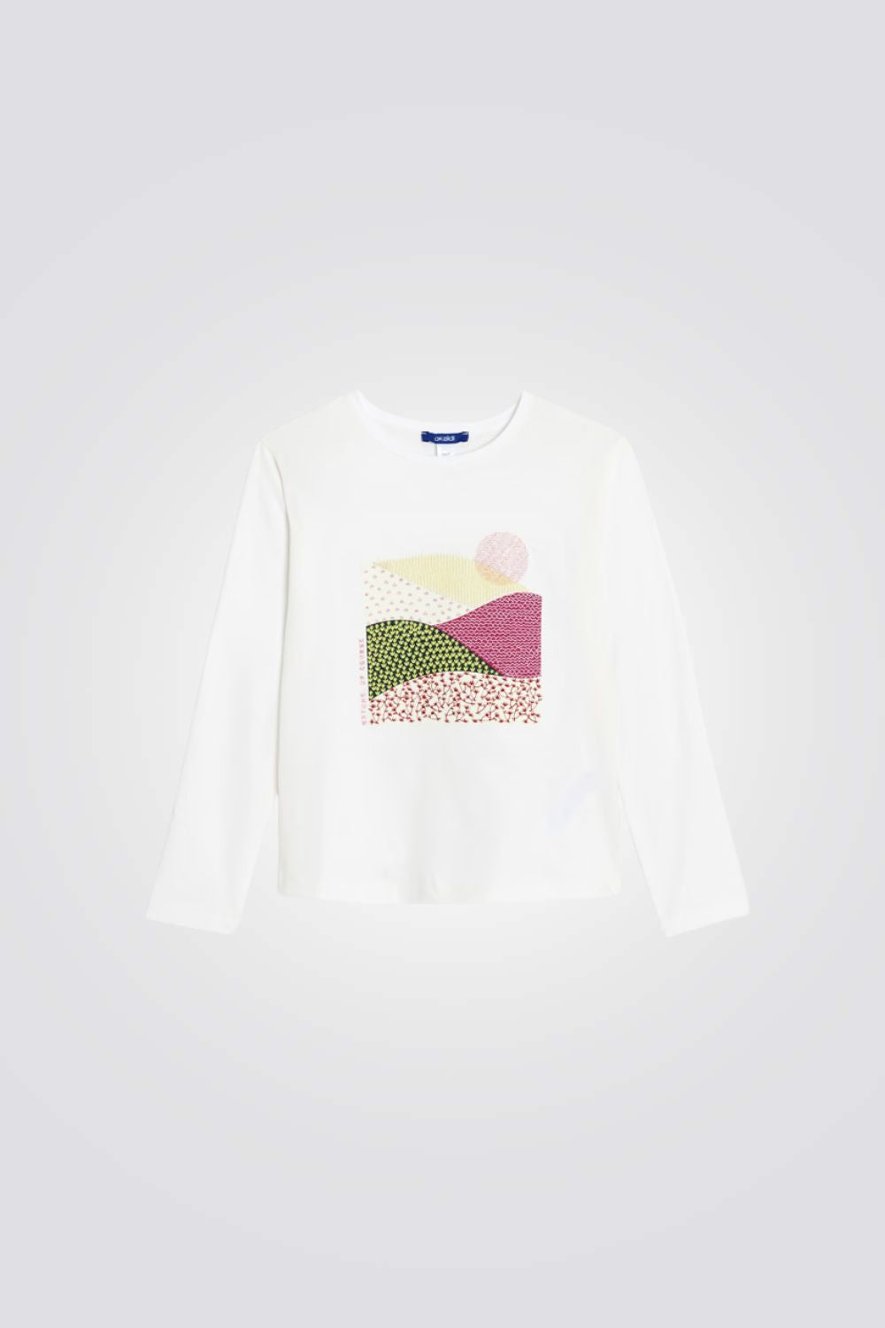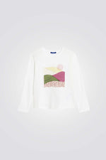 טישירט לילדות מבית המותג OKAIDI, בצבע לבן עם הדפס בחזית, עשויה מבד ג'רזי קליל ונעים, שרוולים ארוכים וצווארון עגול.