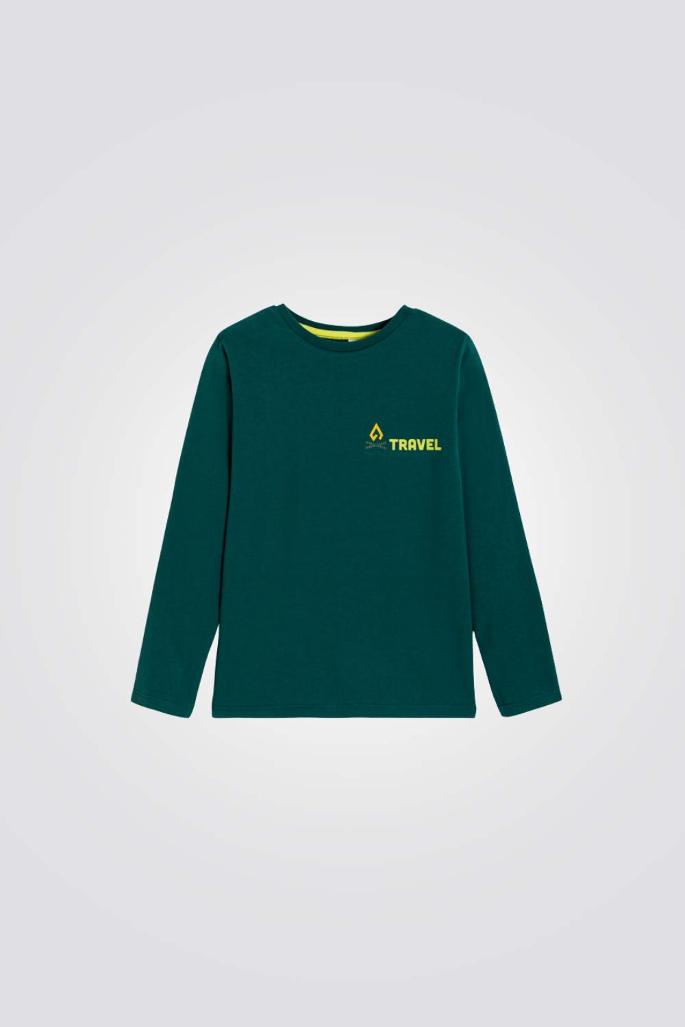 טישירט לילדים מבית המותג OKAIDI, בצבע ירוק כהה, עשויה מבד ג'רזי רך ונעים, עם שרוולים ארוכים, הדפס בחזה, וצווארון עגול.
