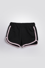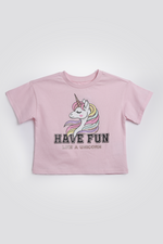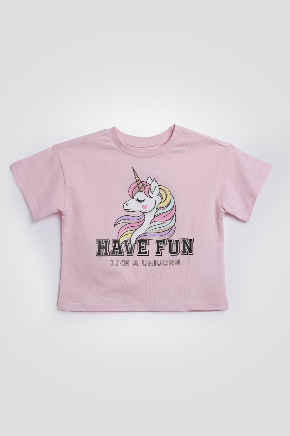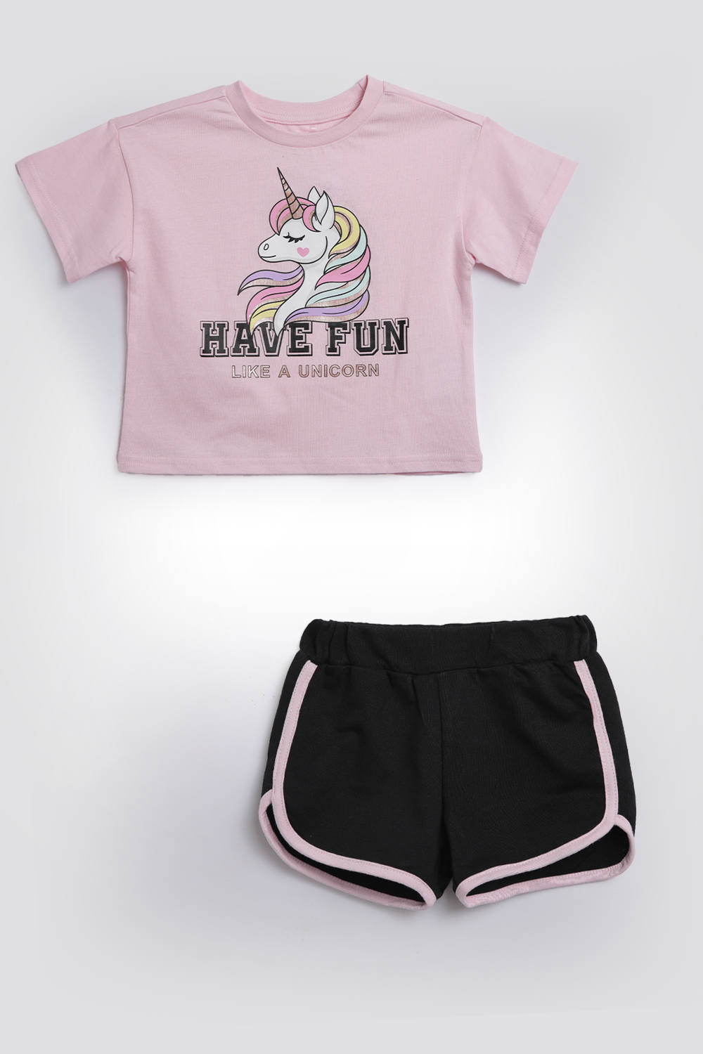 חליפת גן לילדות מבית המותג DELTA המורכבת מחולצת טישירט קצרה עם מפתח צאוור עגול והדפס מתוק של חד קרן וממכנסיים קצרים בצבע שחור.