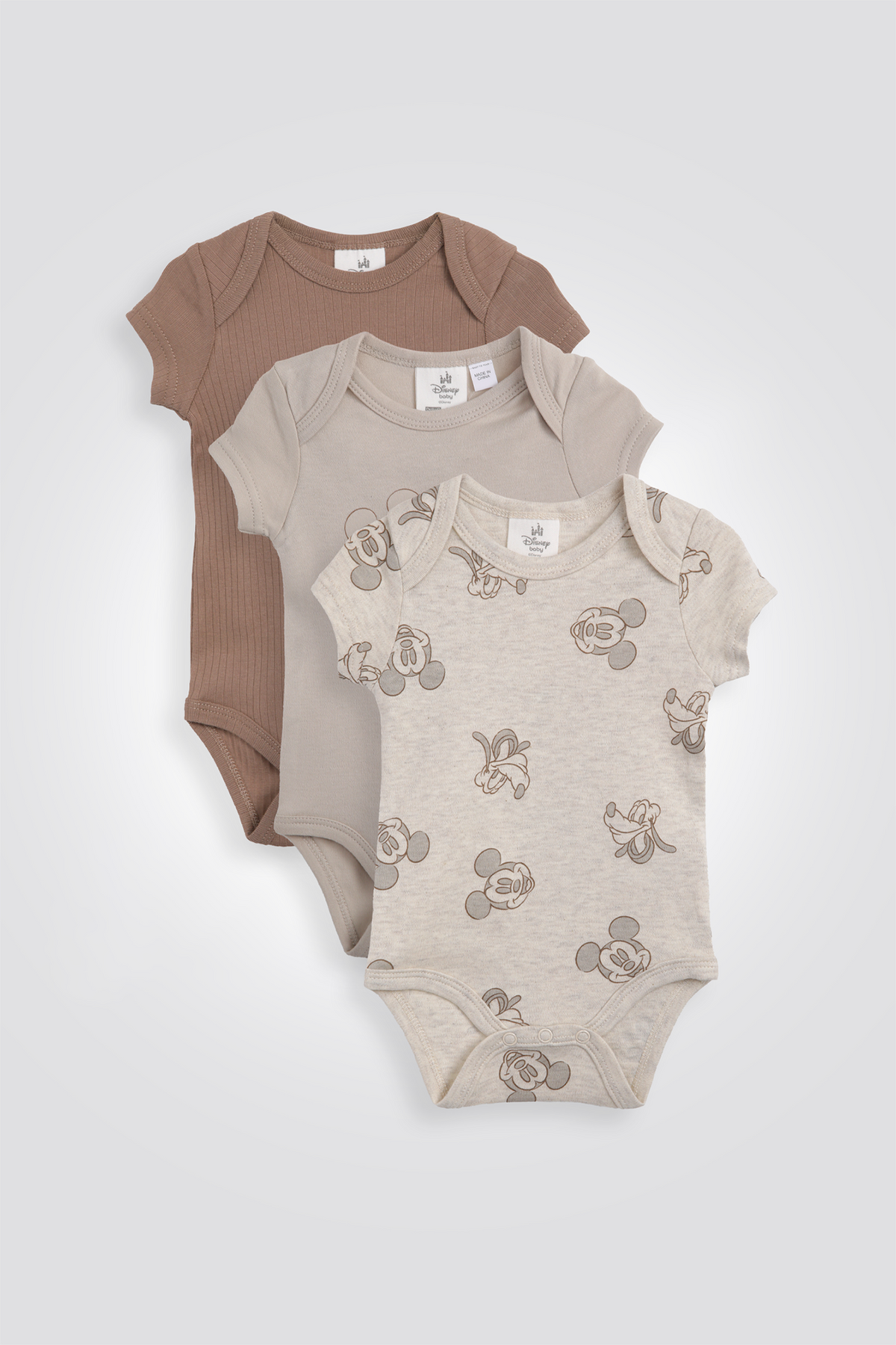 שלישיית בגדי גוף קצרים מבית המותג DELTA העשויים מבד בטקסטורת ריב עם הדפס מתוק של מיקי מאוס, מפתח צוואר עגול, שרוולים קצרים וסוגרי תיקתק בתחתית.