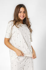 הסט מורכב מחולצה עם צווארון עגול ושרוולים קצרים ומכנסיים ארוכים עם גומי במותניים.