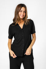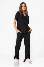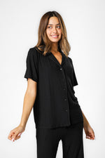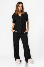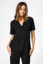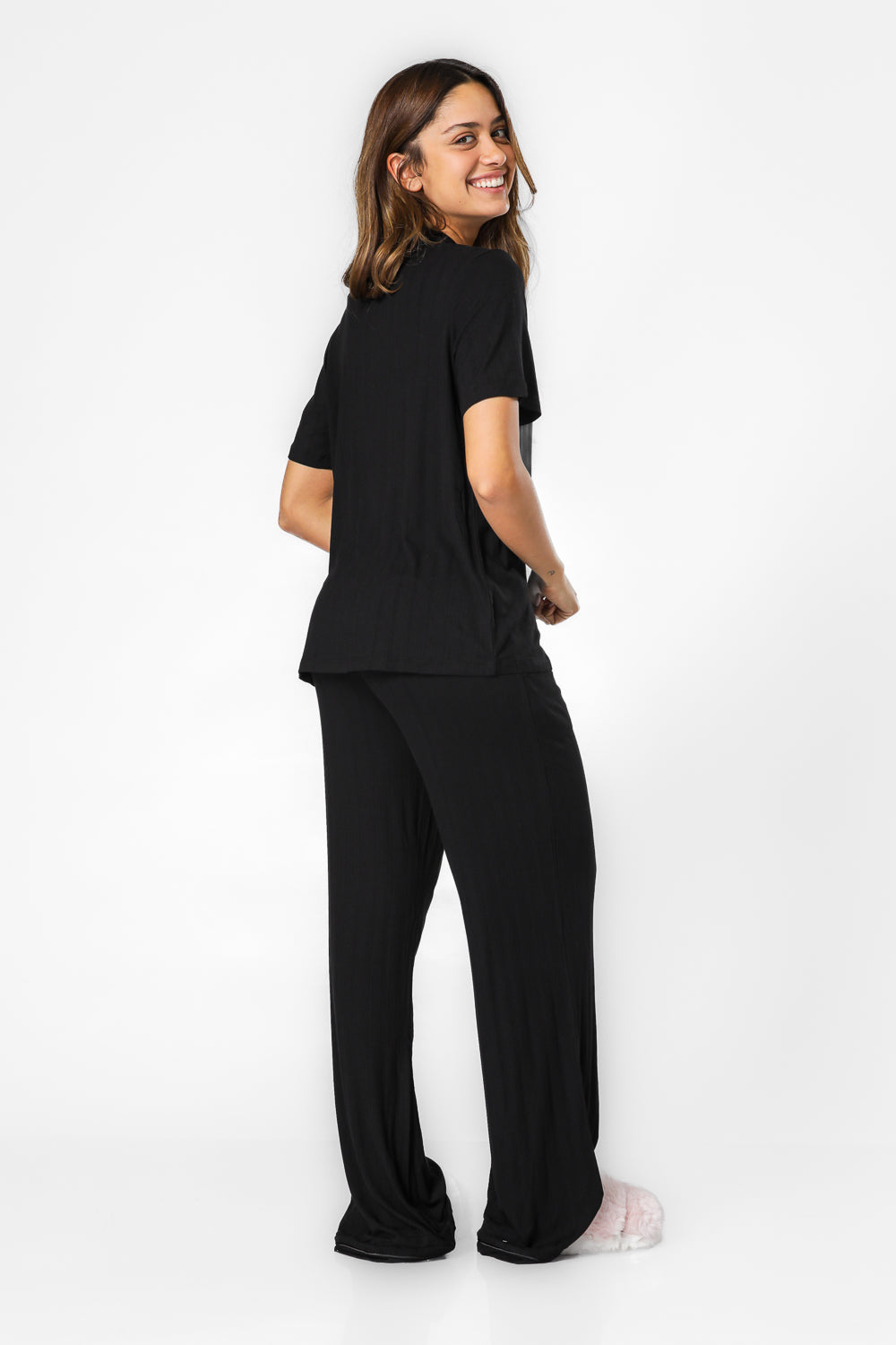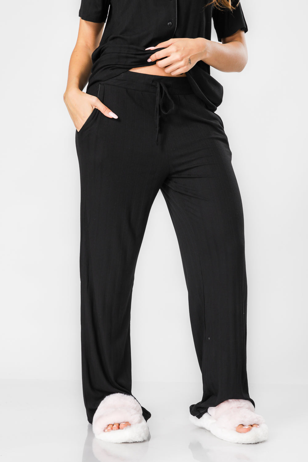 סט פיג'מת מעבר מבית המותג DELTA בטקסטורת ריב נעימה. חולצה מכופתרת עם צווארון משולשים ושרוולים קצרים, ומכנסיים ארוכים בגזרה נינוחה עם גומי במותניים, שרוכי קשירה וכיסים.