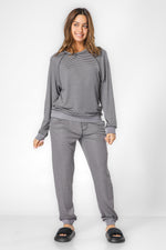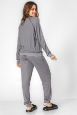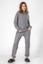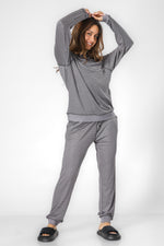הסט מורכב מחולצה עם צווארון עגול ושרוולים ארוכים ומכנסיים ארוכים עם גומי במותניים.