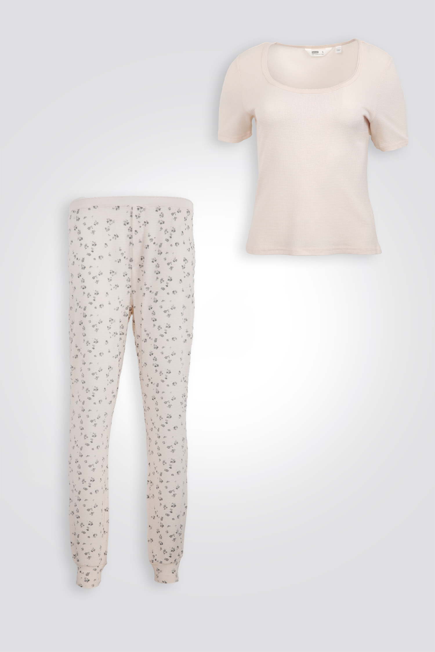 פיג'מת מעבר דקיקה מבית המותג DELTA בעלת חולצה עם צווארון עגול ושרוולים קצרים ומכנסיים ארוכים עם הדפס פרחים וגומי במותניים.