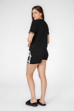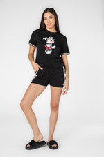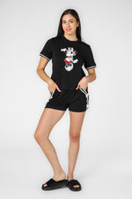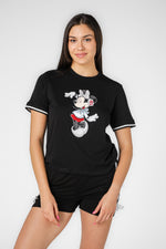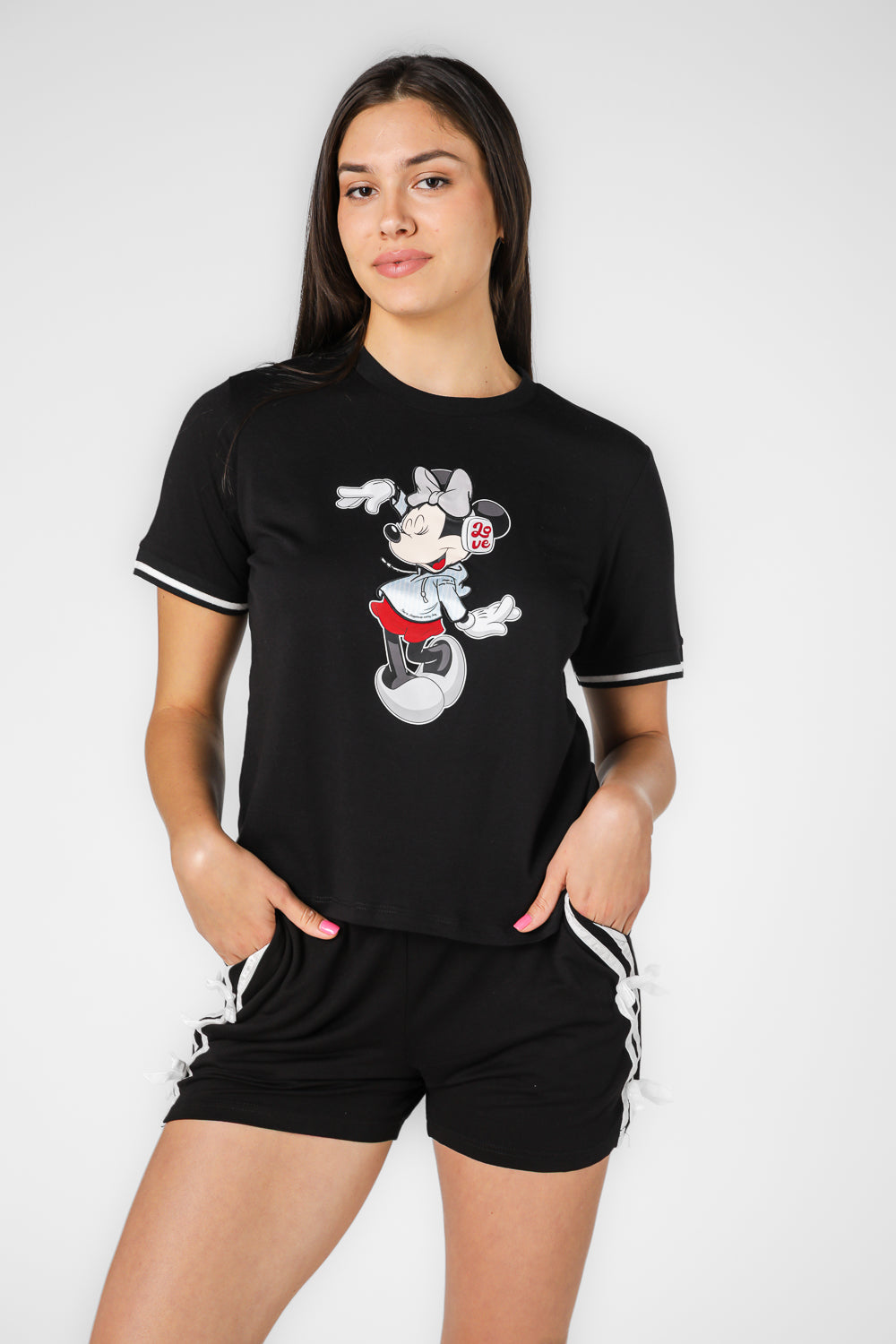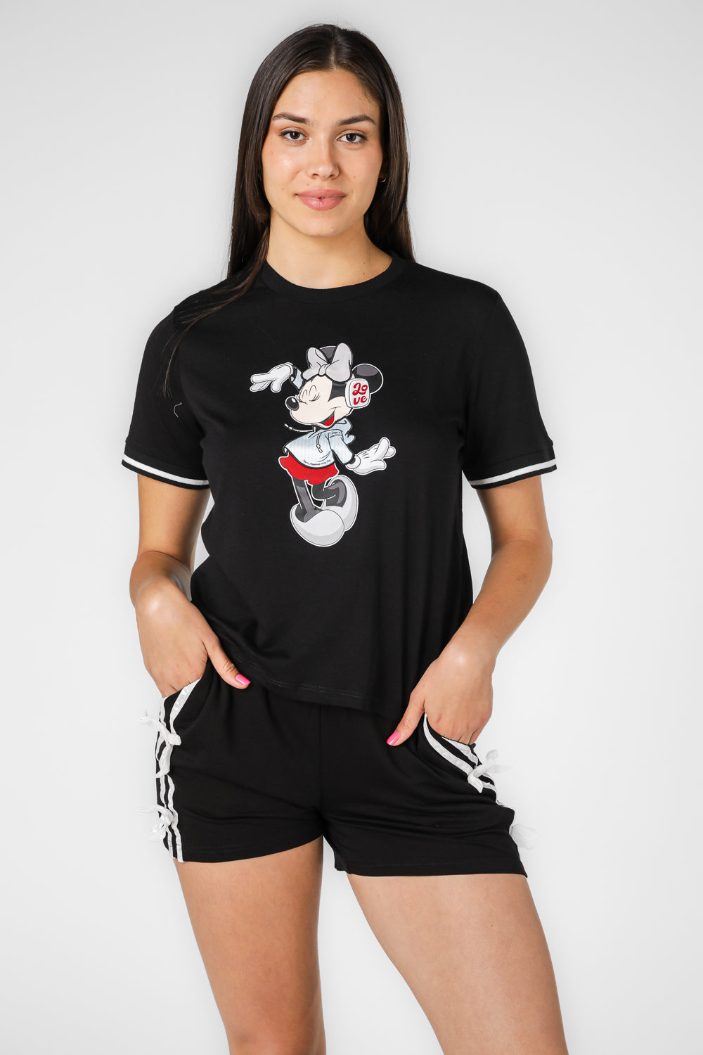 פיג'מת קיץ לנשים מבית המותג DELTA העשויה מבד דק ונעים עם הדפס של מיני מאוס. חולצה עם צווארון עגול ושרוולים קצרים ומכנסיים קצרים עם גומי במותניים, פפיונים וכיסים.