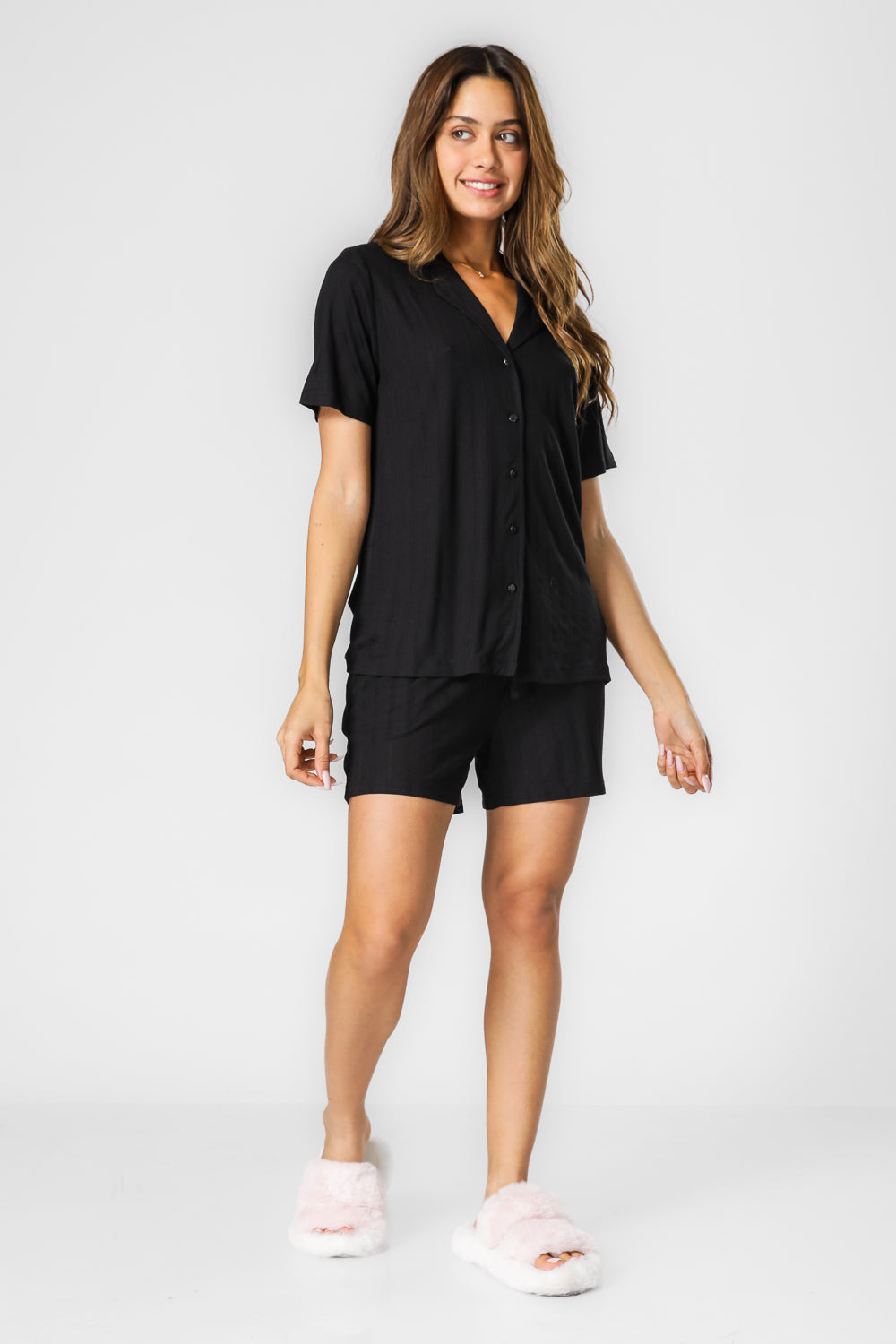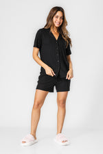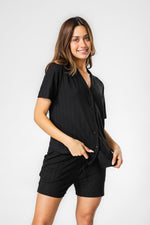סט פיג'מת קיץ מבית המותג DELTA בטקסטורת ריב נעימה. חולצה מכופתרת עם צווארון משולשים ושרוולים קצרים, ומכנסיים ארוכים בגזרה נינוחה עם גומי במותניים, שרוכי קשירה וכיסים.