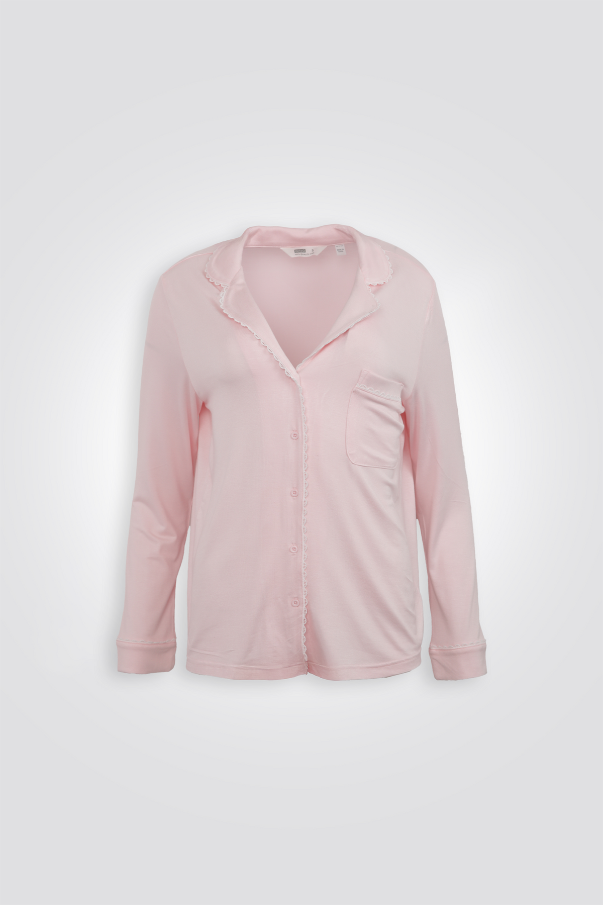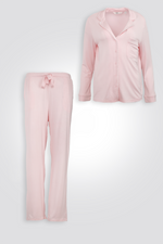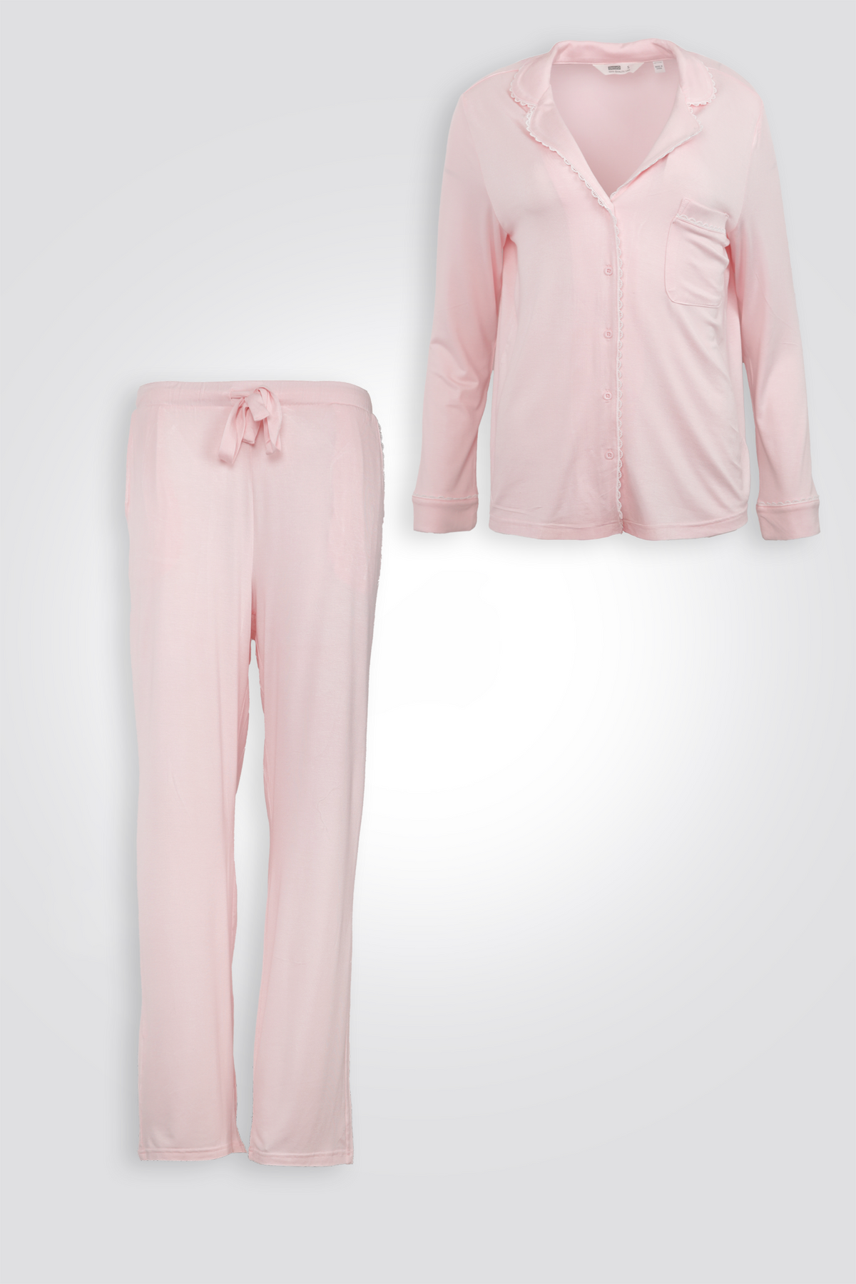 פיג'מת מעבר לנשים מבית המותג DELTA בגזרה נינוחה בשילוב בד מודל רך ונעים הכולל חולצה מכופתרת עם צווארון משולשים ושרוולים ארוכים ומכנסיים ארוכים תואמים עם גומי במותניים, שרוכי קשירה וכיסים.