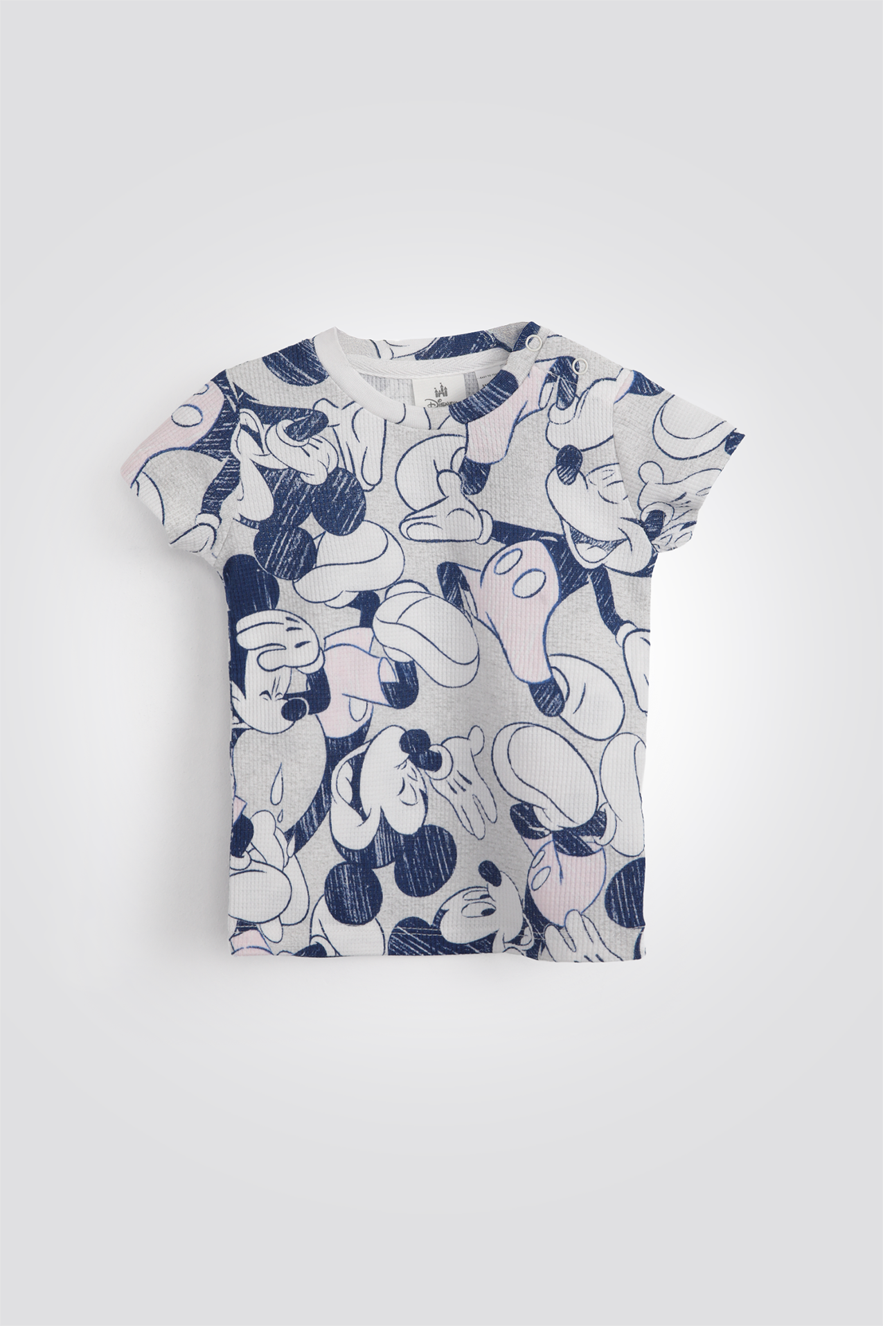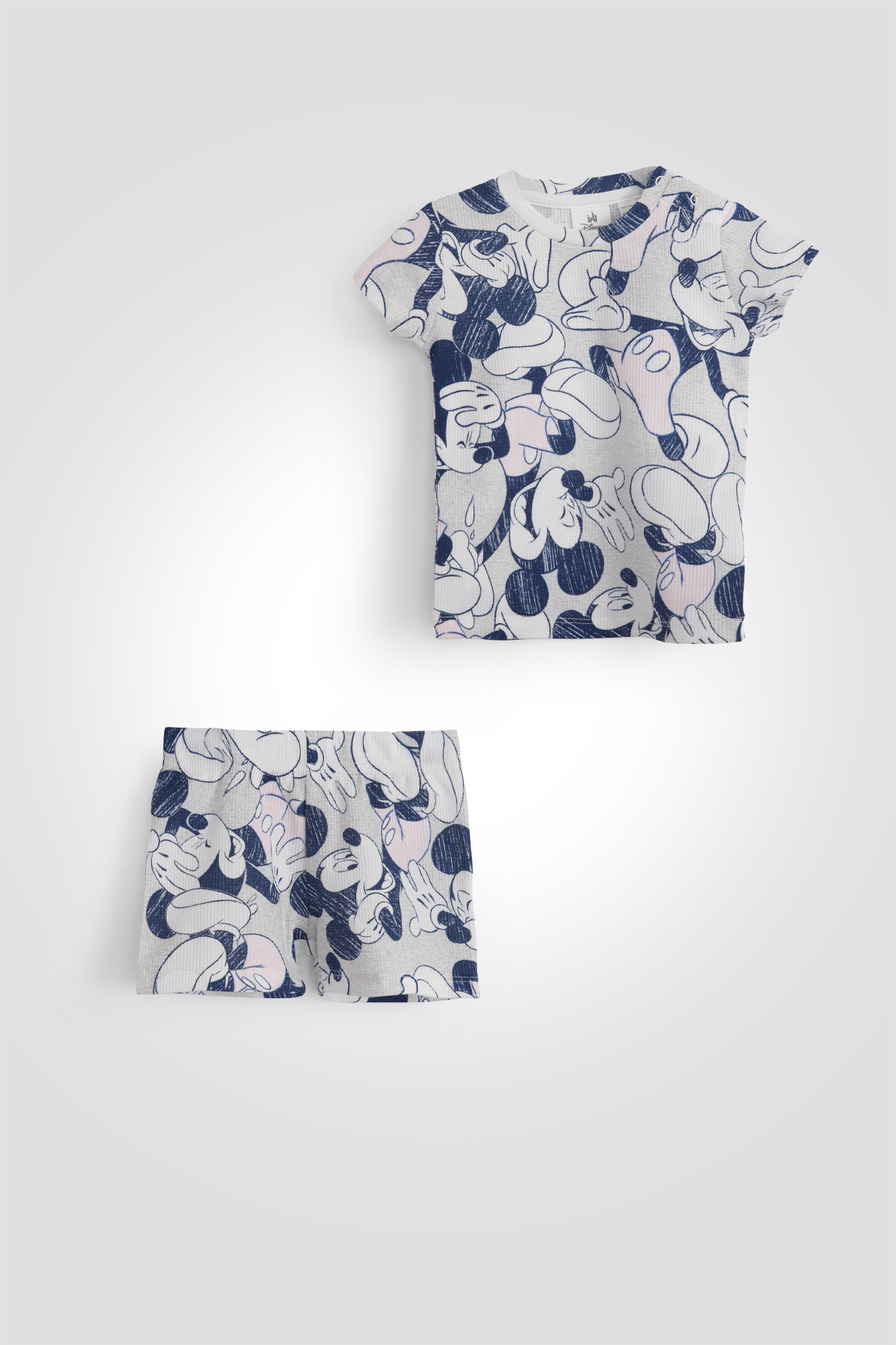 Pיג'מת קיץ לילדות מבית המותג DELTA העשויה מבד דק בטקסטורת וופל נעימה עם הדפס של מיקי מאוס. חולצה עם צווארון עגול, שרוולים קצרים עם סוגרי תיקתק בכתף ומכנסיים קצרים עם גומי במותניים.