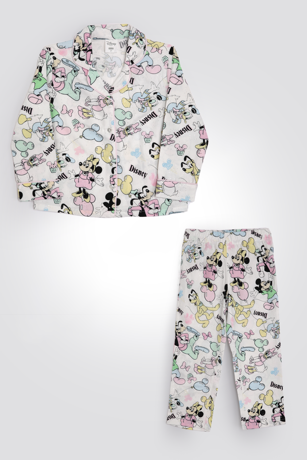 סט פיג'מה מכופתרת לילדות מבית המותג DELTA העשויה מבד פלנל דק ומחמם בהדפסים מתוקים של מיקי וחברים. חולצה מכופתרת עם צווארון משולשים ושרוולים ארוכים ומכנסיים ארוכים תואמים בגזרה ישרה עם שרוכי קשירה.