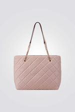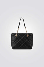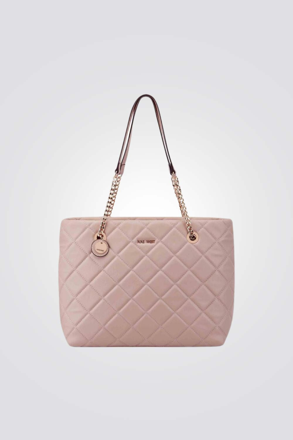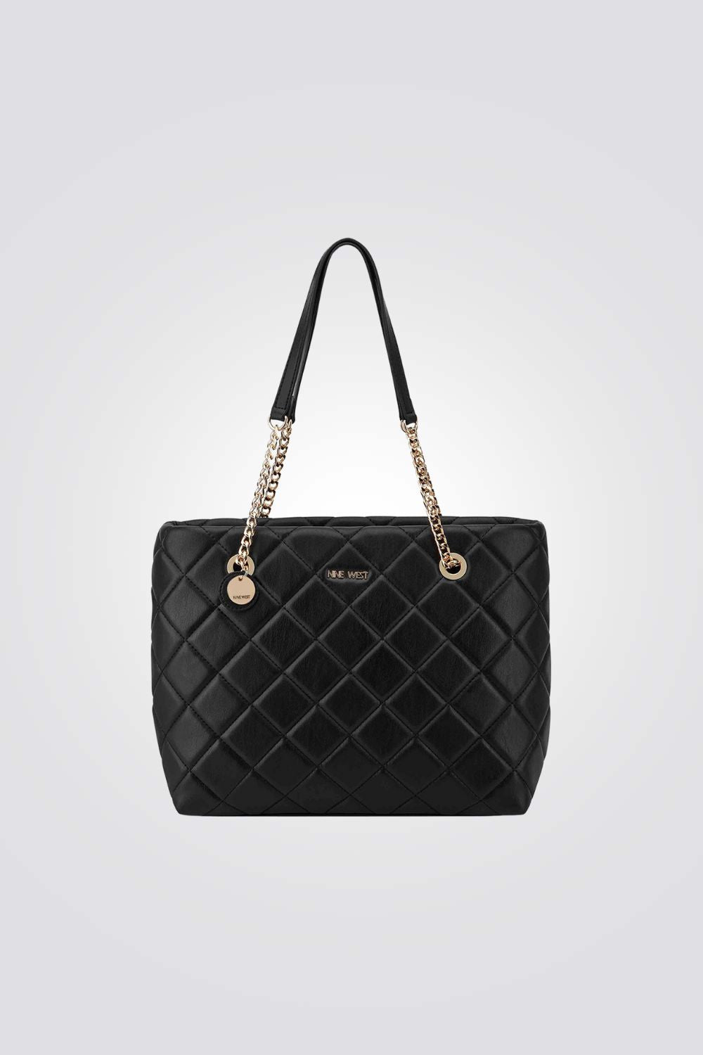 תיק יד לנשים מבית המותג NINE WEST, בעל גזרה קלאסית, בגודל נוח ופרקטי המספק שפע של מקום אחסון. מעוצב בסטייל יוקרתי ומרשים המשלב דוגמת תיפורים גיאומטרית, סוגר מתוכשט ורצועת שרשרת עדינה.