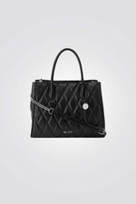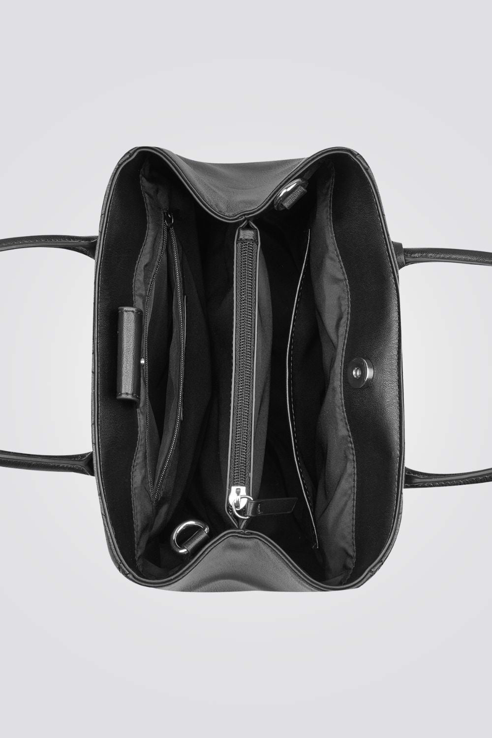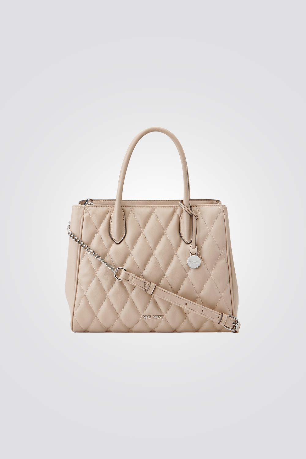 תיק יד לנשים מבית המותג NINE WEST, בעיצוב אלגנטי, שלושה תאים עם סגירת רוכסן וכפתור, ושני תאים פנימיים.