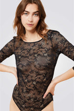 בגד גוף שקוף מבית המותג ETAM, עשוי בד תחרה סינטטי ומיוחד בדוגמאת פרחים ובטנה מבד כותנה, בעל צאוורון עגול ומפתח גב עגול ועמוק עם שרוולים ארוכים.