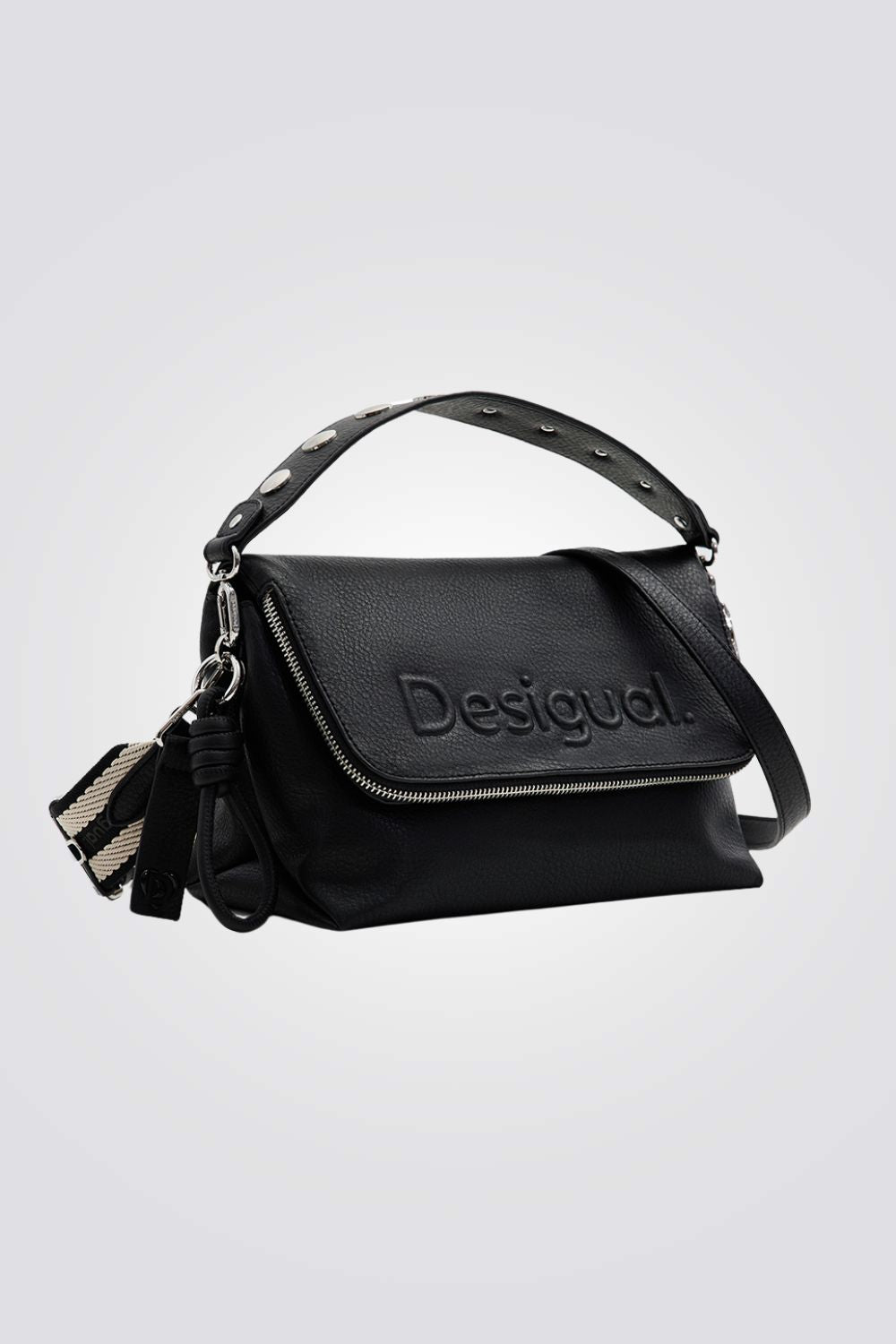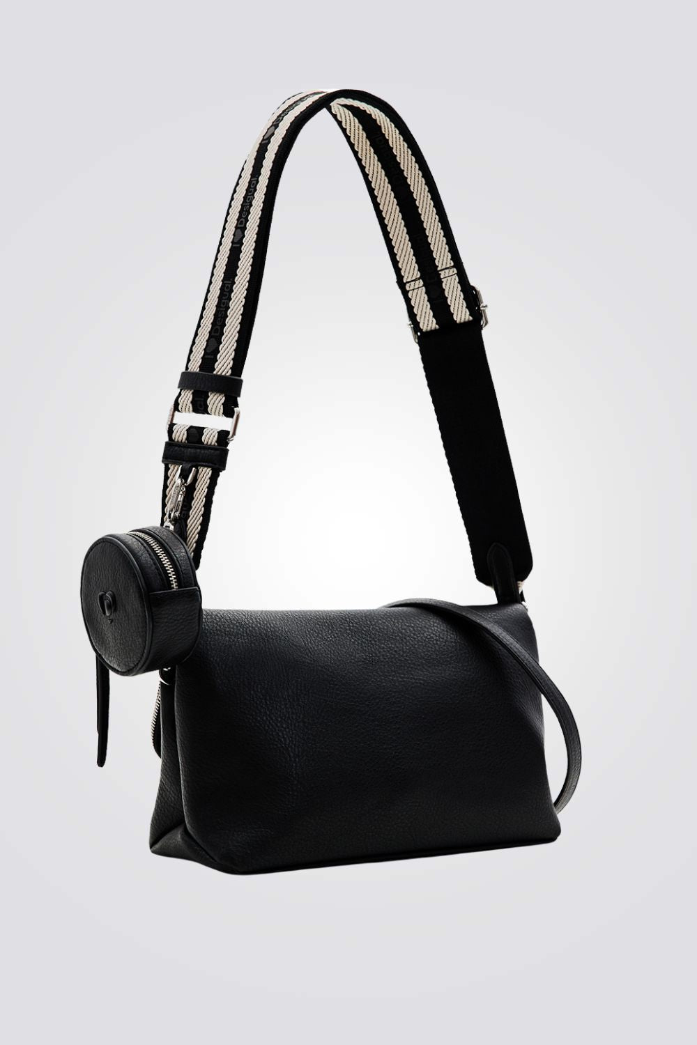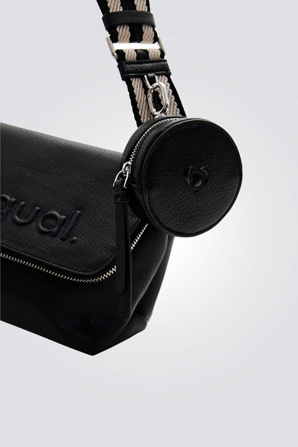 תיק צד לנשים מבית המותג DESIGUAL, בצבע שחור, בעיצוב נקי ומודרני, תא ראשי עם סגירת רוכסן , שני רצועות צד ועוד רצועה קצרה, עם ארנק קטן ועגול מחובר.