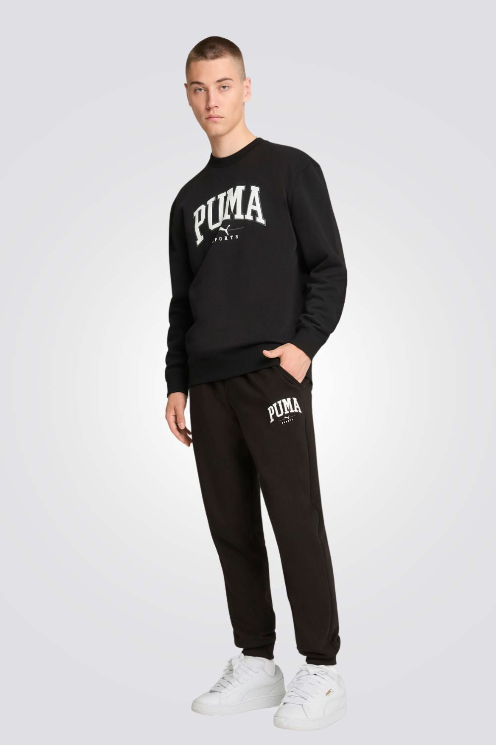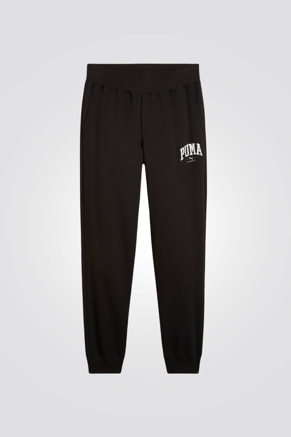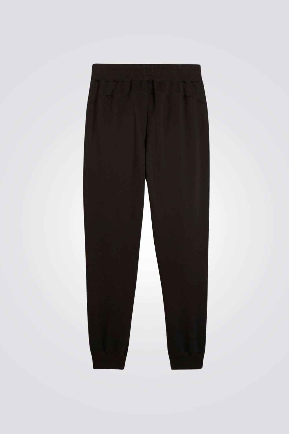 מכנסי טרנינג לגברים מבית המותג PUMA, בצבע שחור, מחממים ונעימים עם לוגו המותג, מותן אלסטית וסיומת גומי ברגליים.