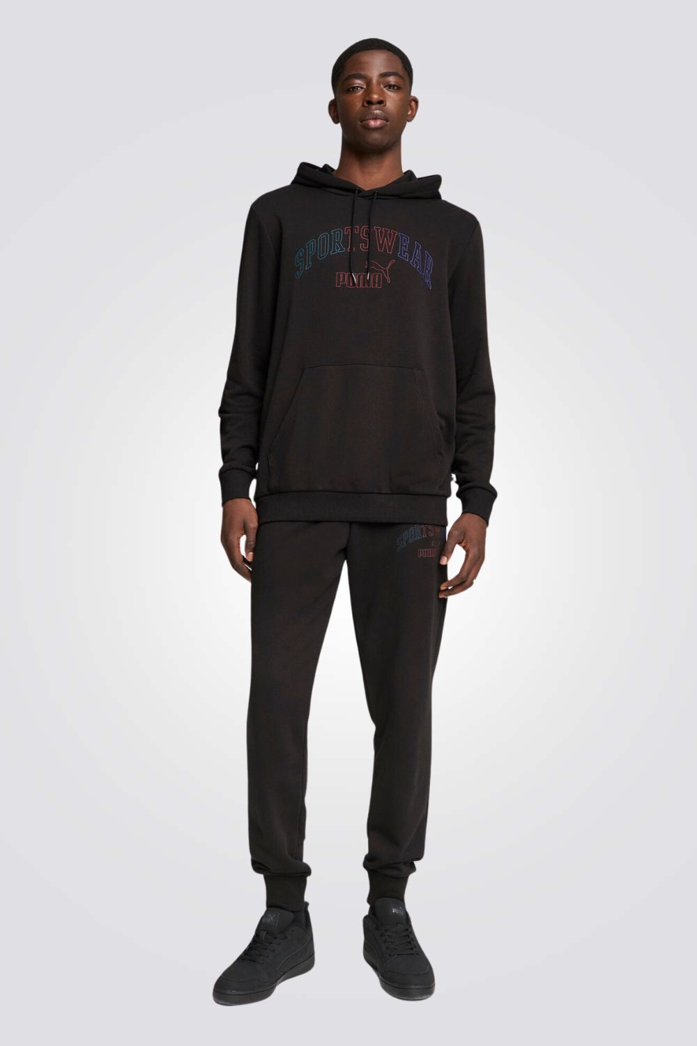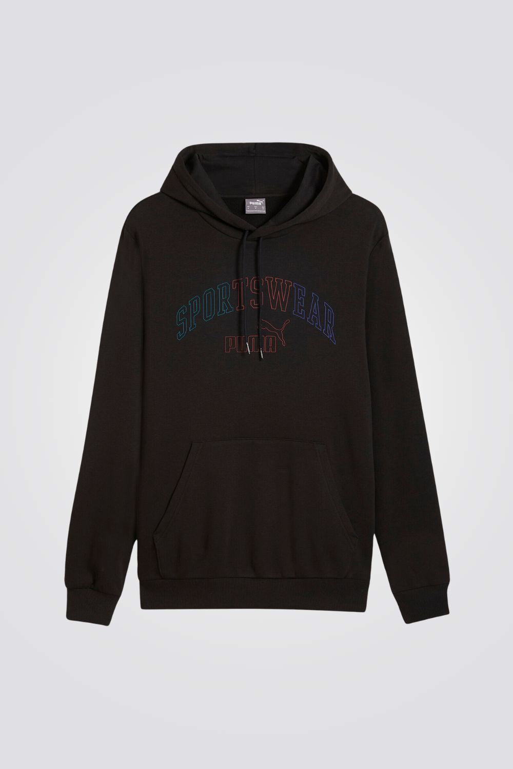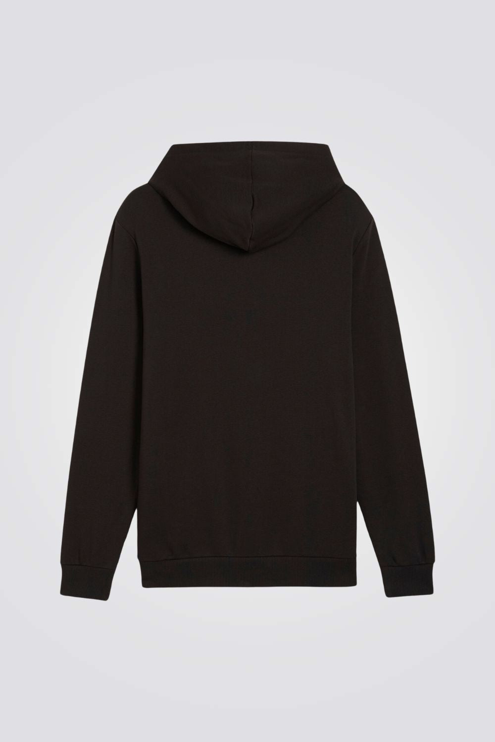 סווטשירט קפוצ'ון לגברים מבית המותג PUMA, בצבע שחור, מחמם ונעים, עם לוגו המותג וכיס קנגרו.