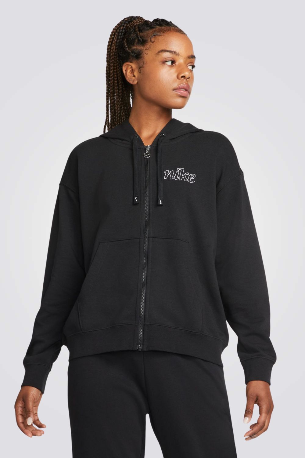 סווטשירט לנשים מבית המותג NIKE,בצבע שחור עם קפוצ'ון, מחמם ונעים, עשוי מבד מנדף זיעה ומתאים לאימונים, סגירת רוכסן ושני כיסים צדדיים.