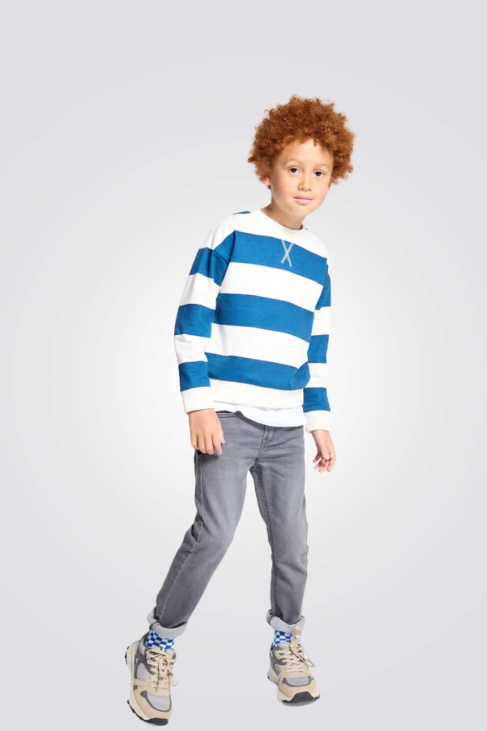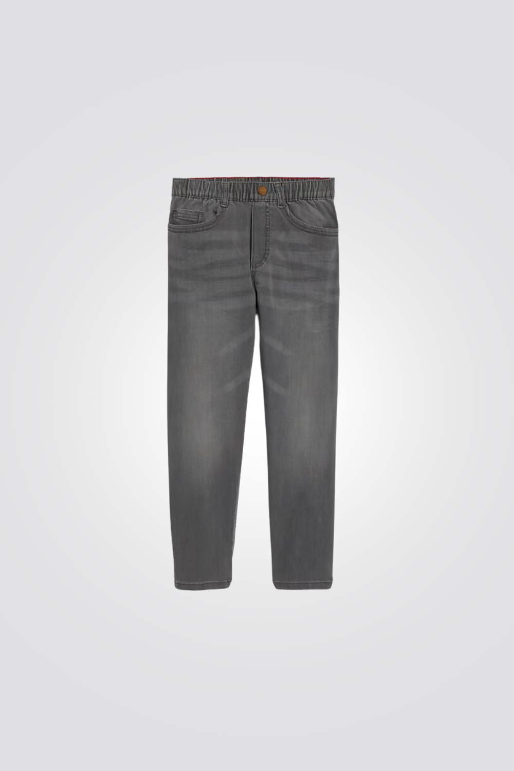 מכנסי ג'ינס לילדים מבית המותג OKAIDI, בצבע אפור עם מותניים אלסטיות וחמישה כיסים.