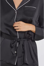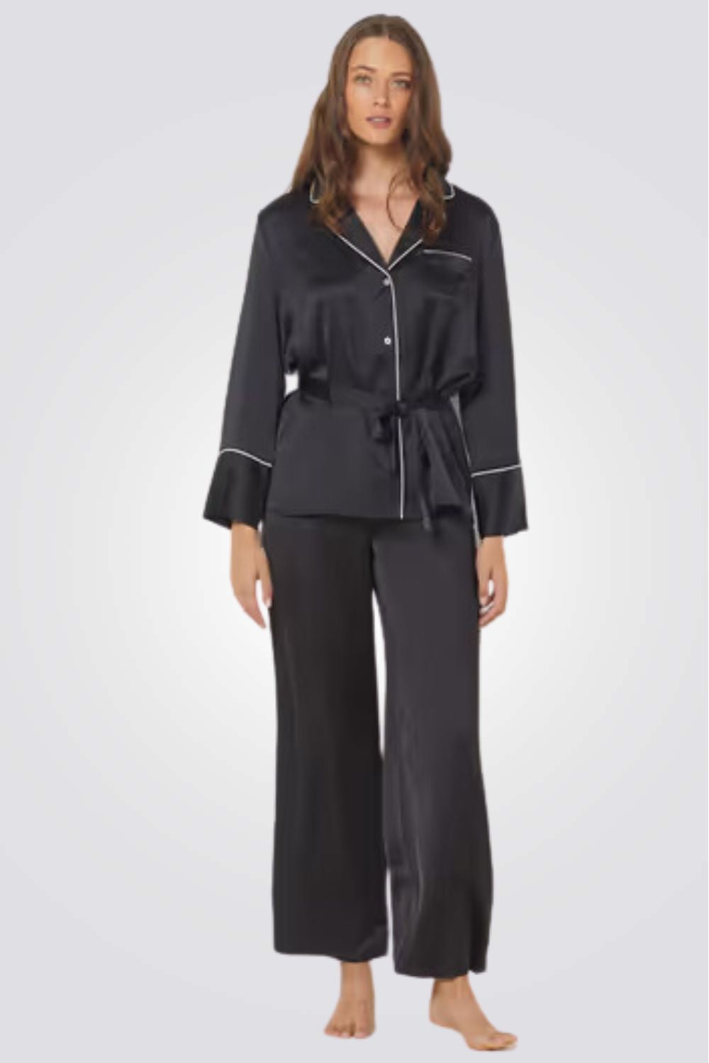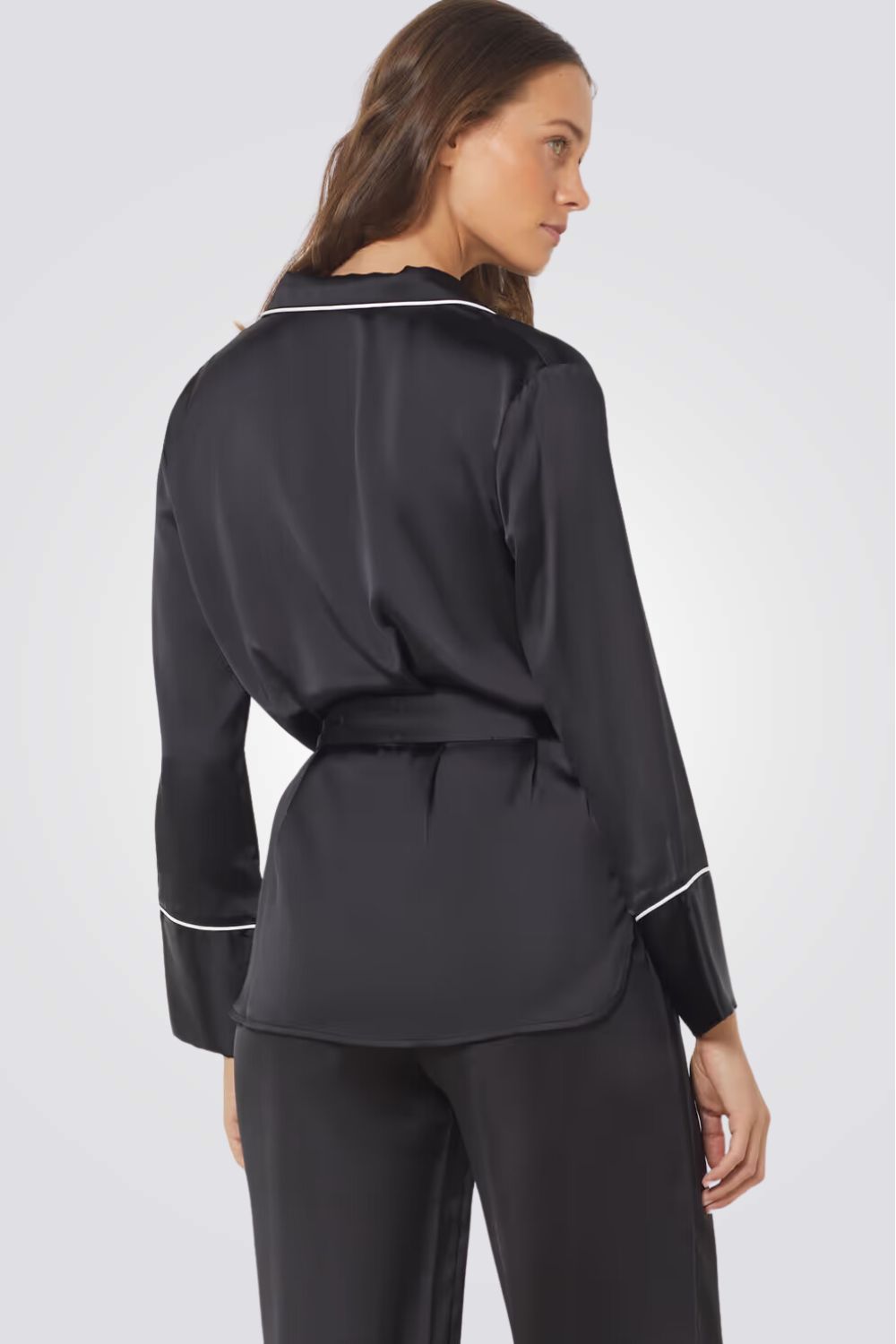 חולצת פיג'מה מכופתרת מבית המותג הצרפתי ETAM, מגיעה עם שרוולים ארוכים, פסים עדינים לבנים בקצוות ושרוך קשירה בקו המותניים.