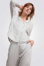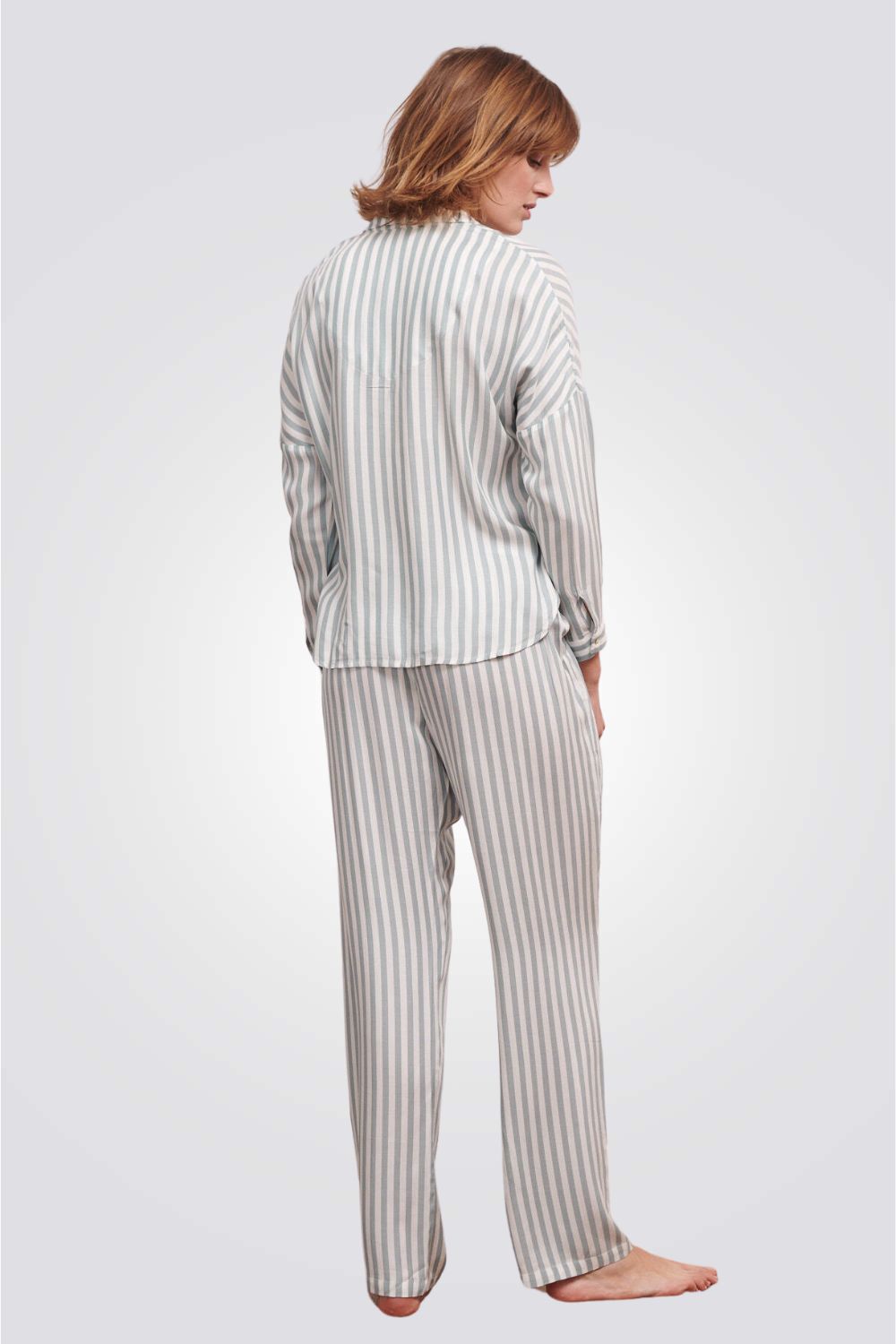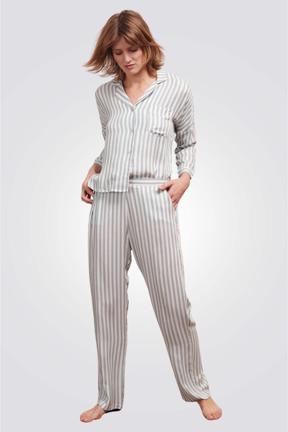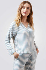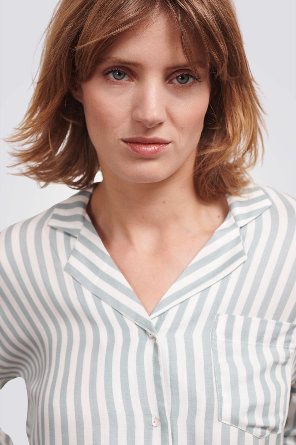 חולצת פיג'מה מכופתרת מבית המותג ETAM, בעלת שרוולים ארוכים, סגירת כפתורים, צווארון דש ובהדפס פסים בצבע כחול