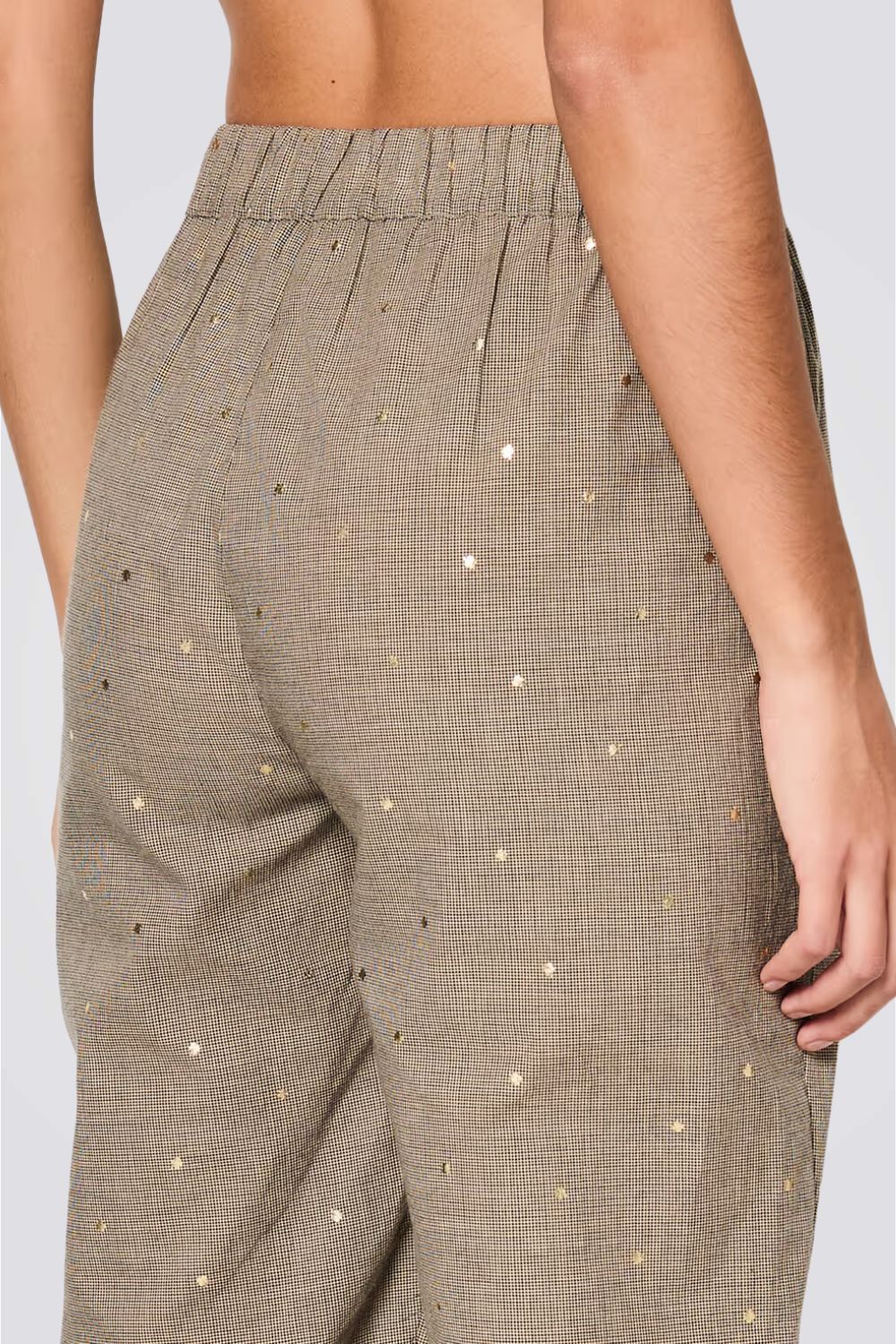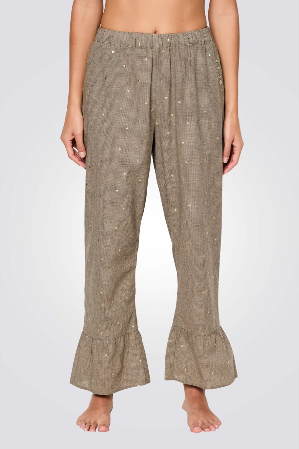 מכנסי פיג'מה מבית המותג הצרפתי ETAM בעלי עיטורים מודפסים בצבע זהב, מכנסיים בגזרה ישרה באורך 7/8 עם מלמלה באיזור הקרסוליים.