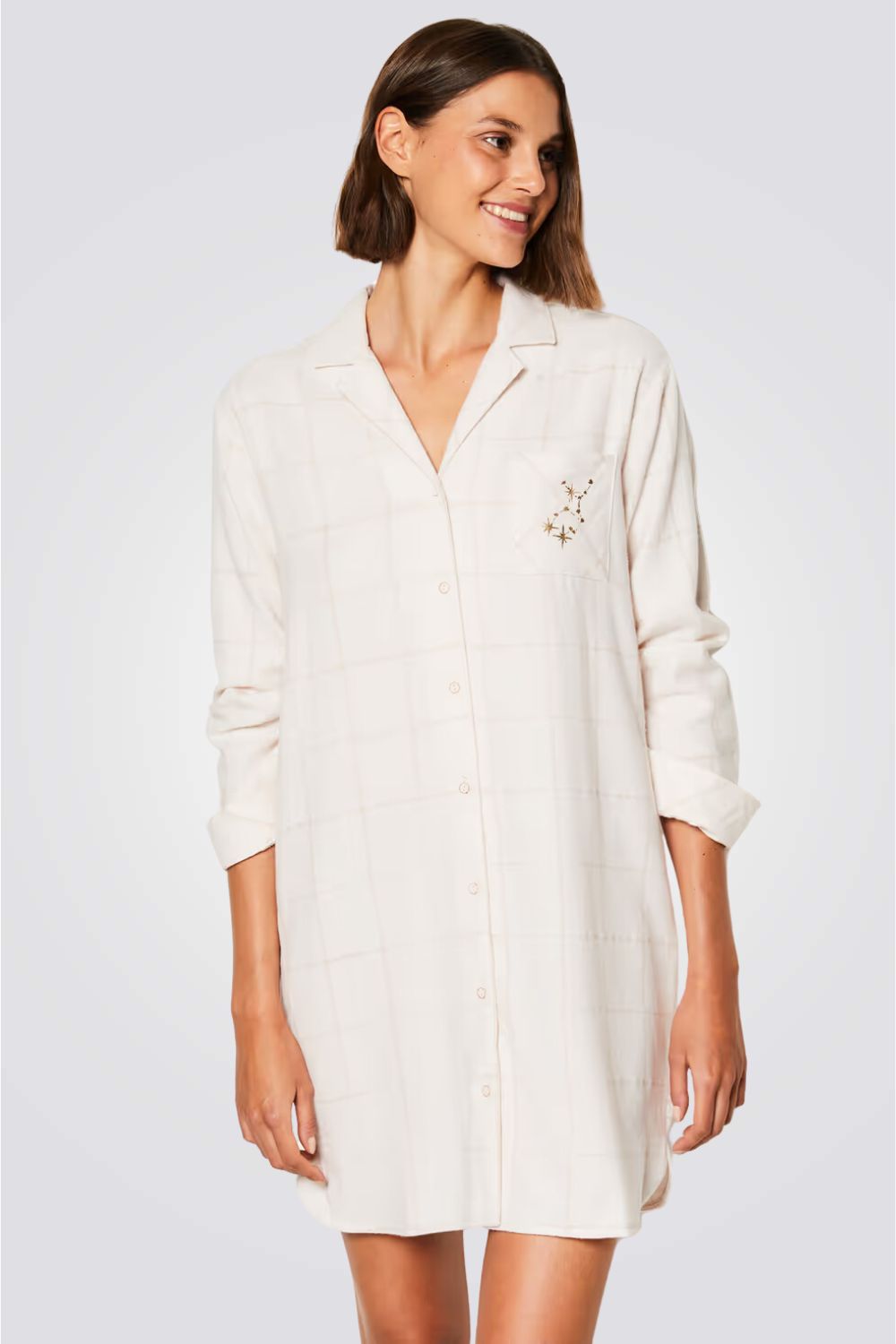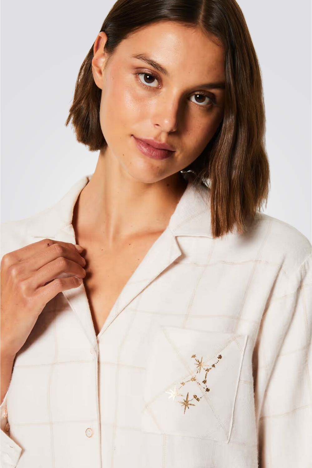 כותונת לילה מכופתרת מבית המותג ETAM באורך עד הברכיים, בעלת שרוולים ארוכים, צווארון דש ועם רקדמה עדינה של כוכבים.