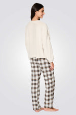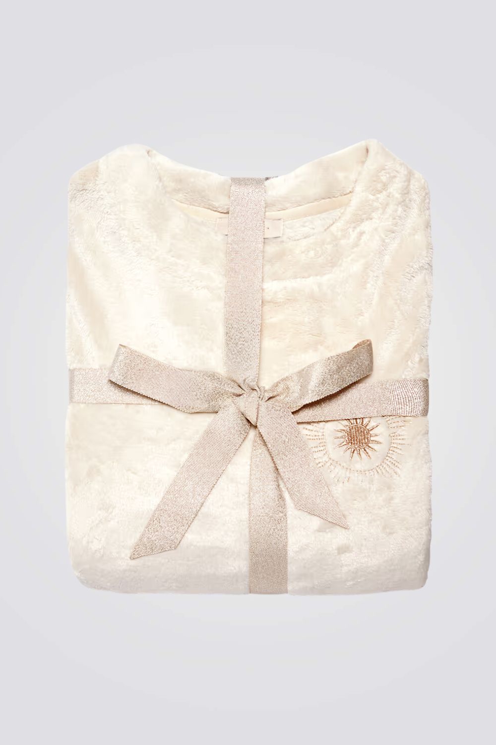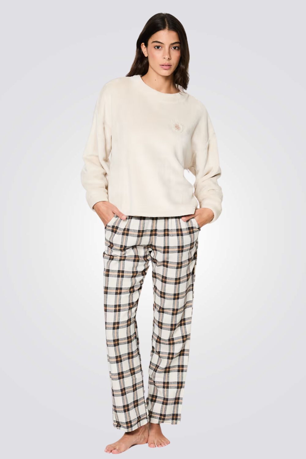 סט פיג'מת חורף מבית המותג ETAM, עשויה בד רך ומפנק, מורכב מחולצה עם שרוולים ארוכים צווארון עגול ורקמת שמש עדינה יחד עם מכנסיים ארוכים תואמים.