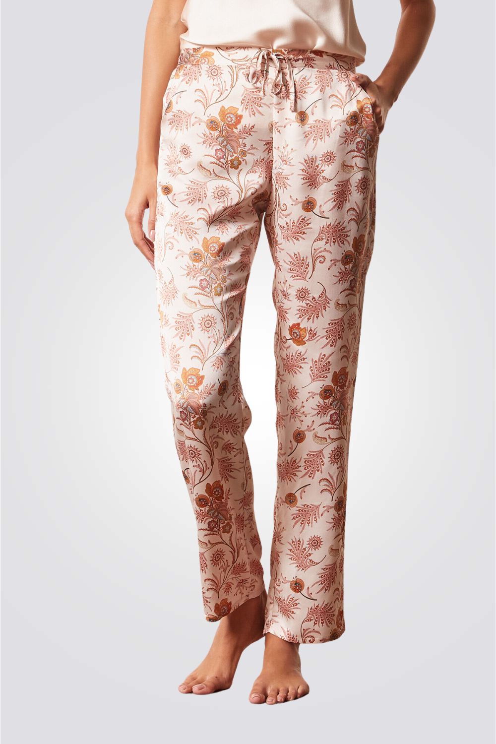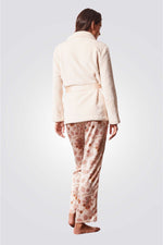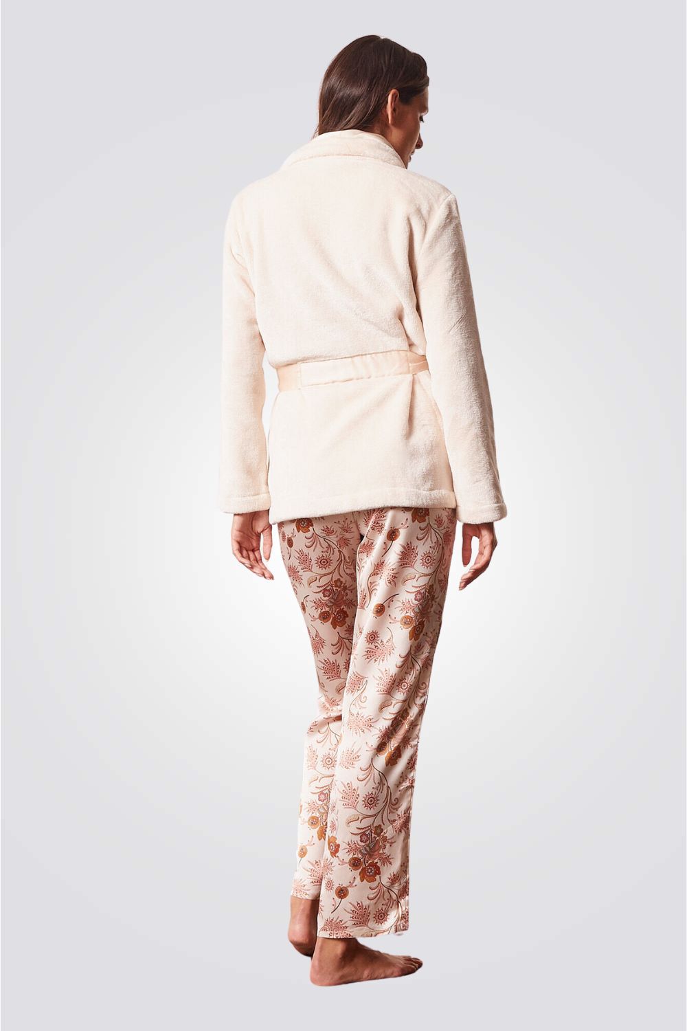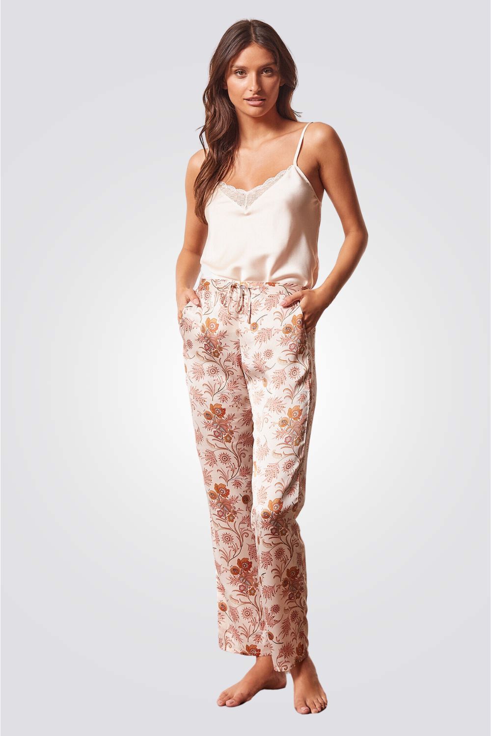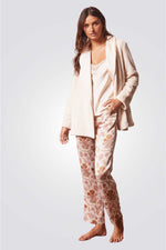הסט כולל מכנסי פיג'מה ארוכים עם הדפס פרחוני ושרוך קשירה, גופיה לבנה עם עיטורי תחרה בקו המחשוף וג'קט ארוך בצבע קרם.